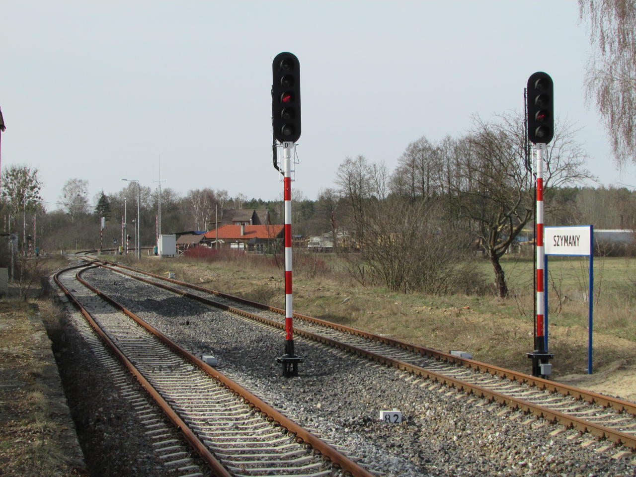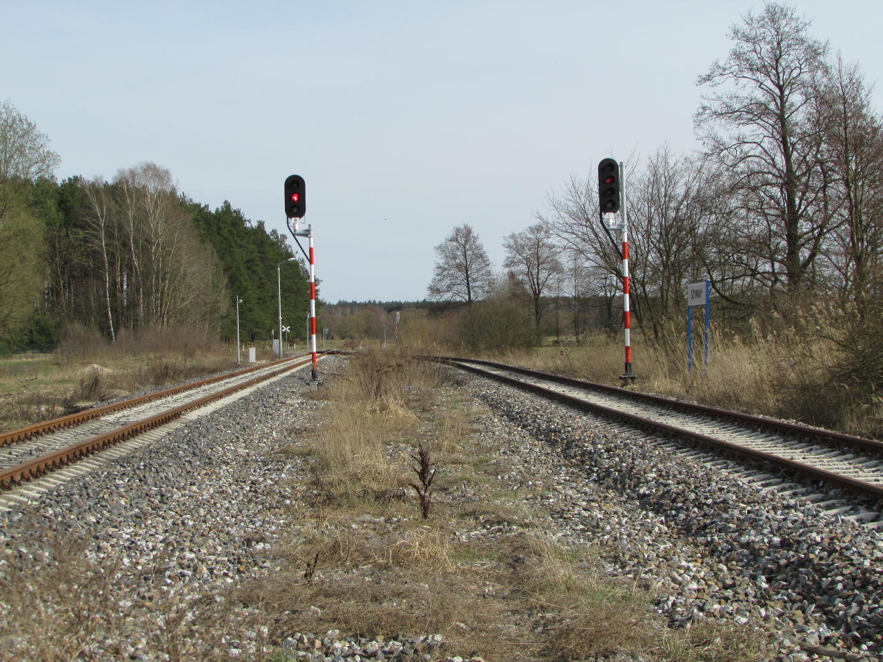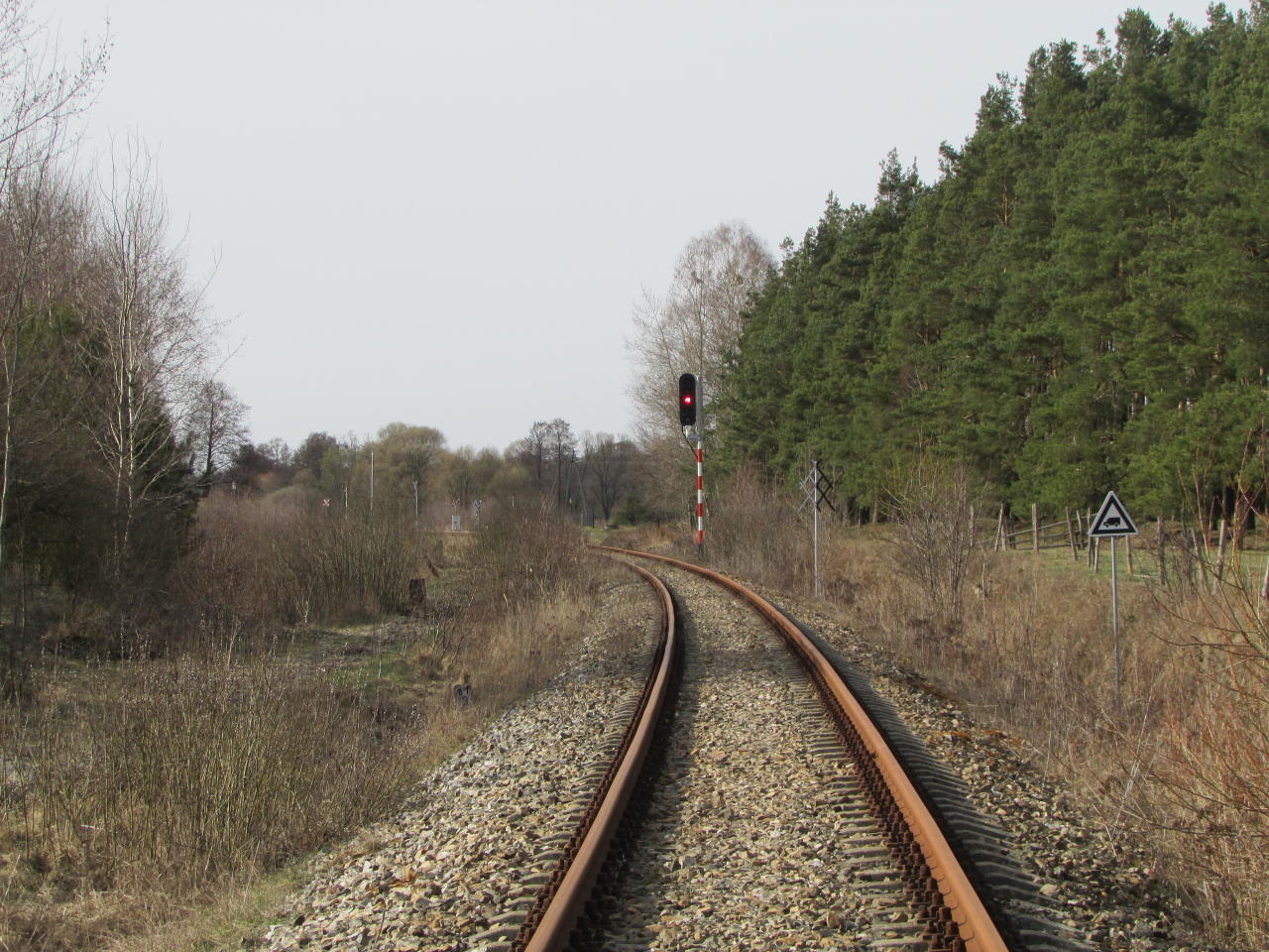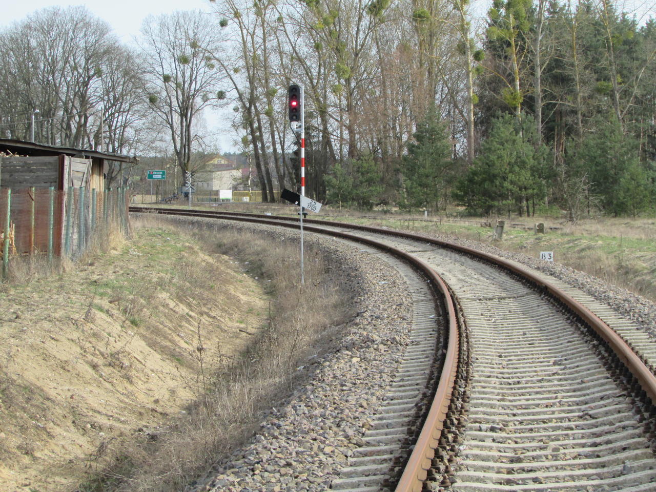 Wyjazd w stronę Wielbarka. W oddali widać tarczę ostrzegawczą odnoszącą się do semafora A.