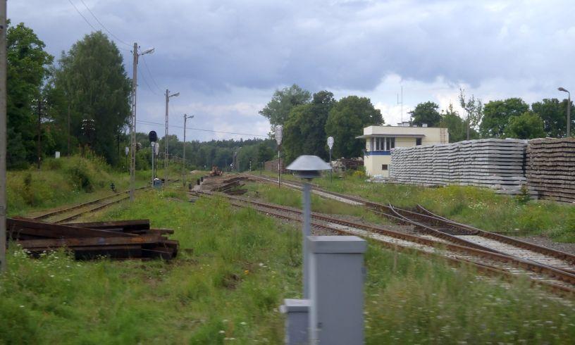 Kolejowy budynek mieszkalny z przyległą częścią z pomieszczeniami WC (ruina, zainfekowany przez krzaki) widoczny od strony torów. W lewo Olsztyn Główny, w prawo Szczytno/Ełk.