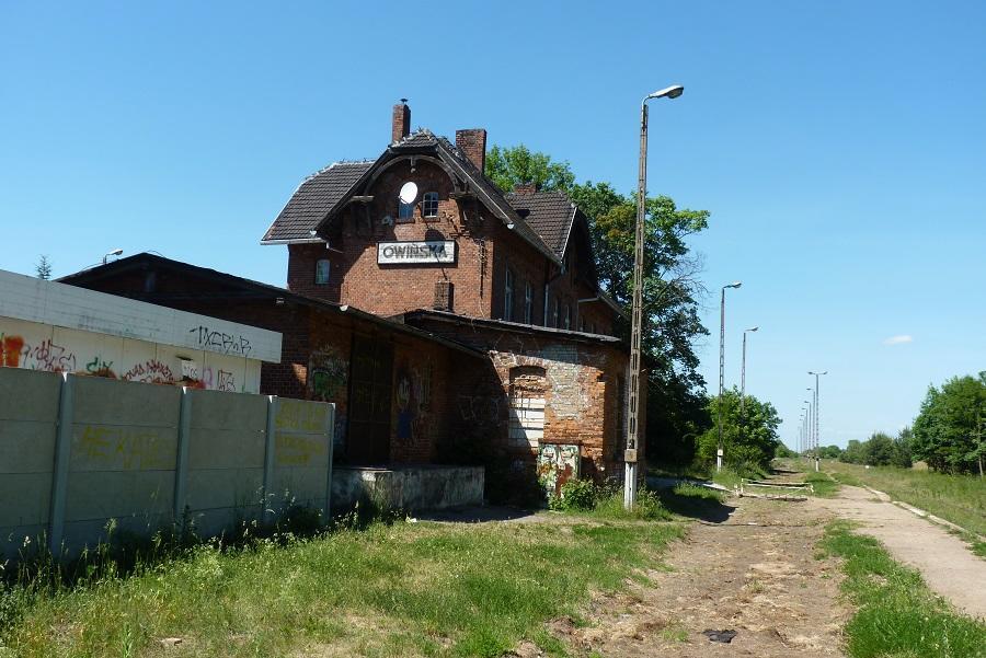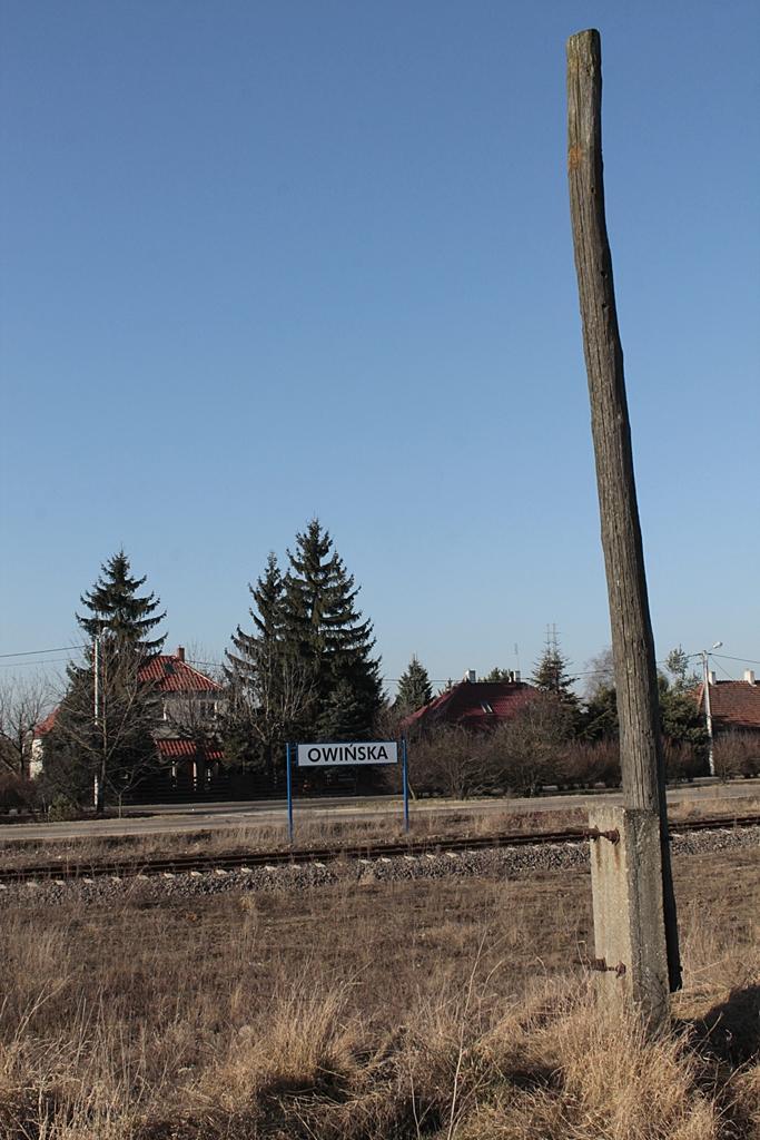 Owińska przed południem. Mała cicha stacyjka czasami przejedzie tu autobus szynowy. Z lewej strony miejsce po rozebranym torze dodatkowym. W oddali przy budynku dworca małe pomieszczenie nastawni zamienione na garaż.