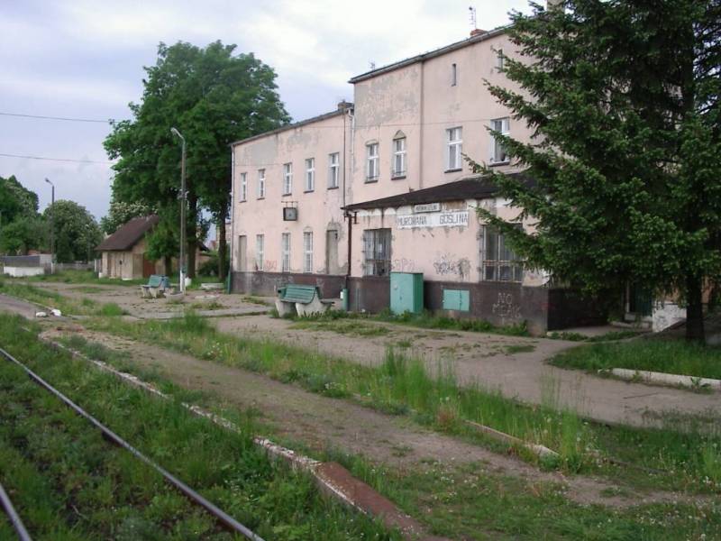Budynek dworca od strony peronów: w lewo Poznań, w prawo Sława Wielkopolska/Wągrowiec. Źródło: fotografia ze zbiorów Izby Regionalnej Ziemi Goślińskiej.