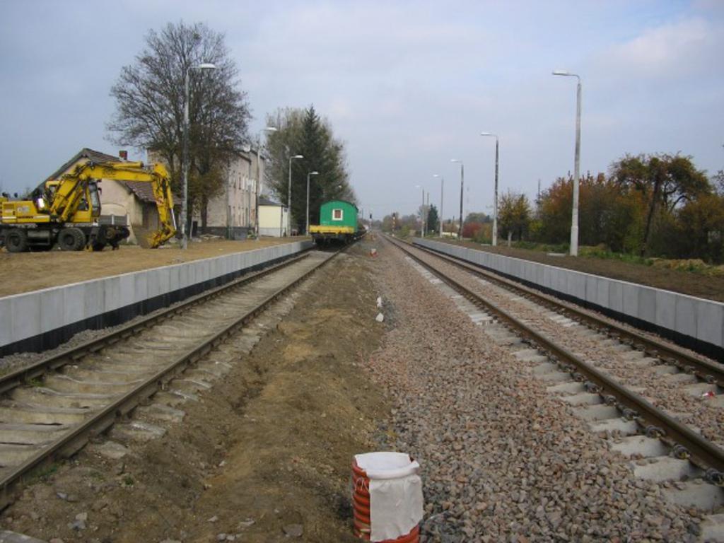 Modernizacja linii kolejowej 356. Nowe perony i tory. Widok od strony Poznania. W tle, po lewej dworzec.