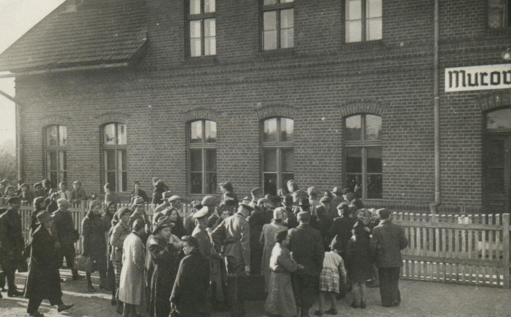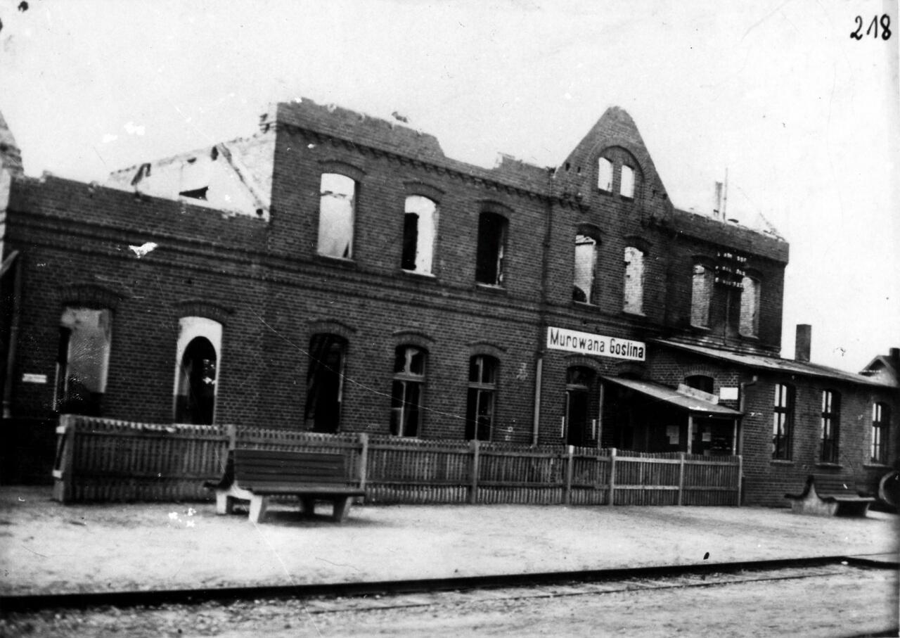 Zniszczenia wojenne na stacji Murowana Goślina. Budynek dworca od strony peronów: w lewo Poznań, w prawo Sława Wielkopolska/Wągrowiec. W przybudówce, po prawej mieściła się nastawnia dysponująca.