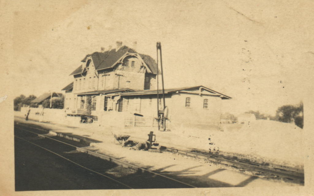 Budynek dworca w okresie swojej świetności - przed 1939 rokiem. Widok od strony podjazdu. Źródło: fotografia ze zbiorów Izby Regionalnej Ziemi Goślińskiej.