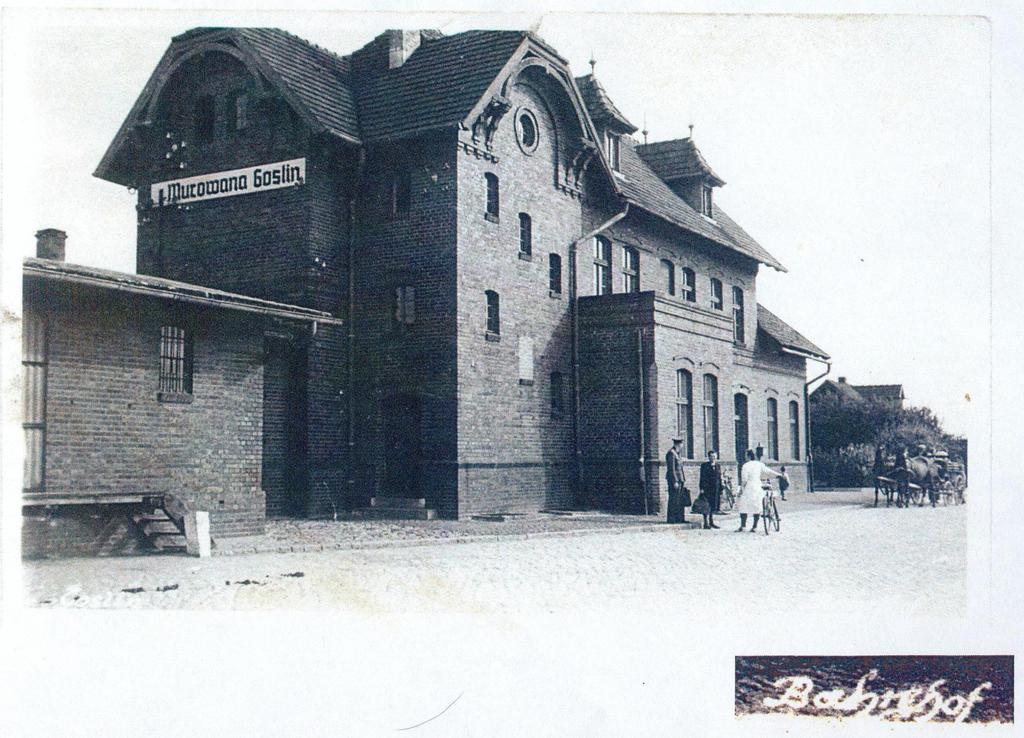 Budynek dworca i magazyn towarowy w Murowanej Goślinie - rok 1942. Widok od strony peronów: w lewo Poznań, w prawo Sława Wielkopolska/Wągrowiec. W przybudówce do dworca mieściła się nastawnia dysponująca. źródło: fotografia ze zbiorów Izby Regionalnej Ziemi Goślińskiej.