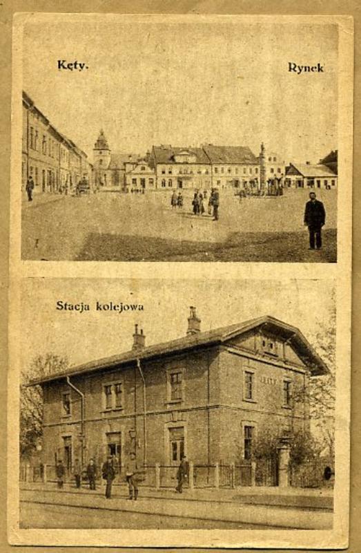 Widok na stację kolejową od strony peronów; w lewo Bielsko-Biała, w prawo Wadowice. Z prawej dworzec, z lewej budynek mieszkalny i wieża wodna.