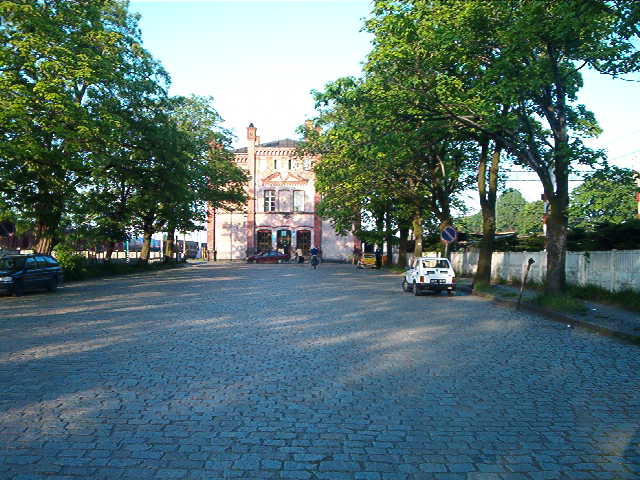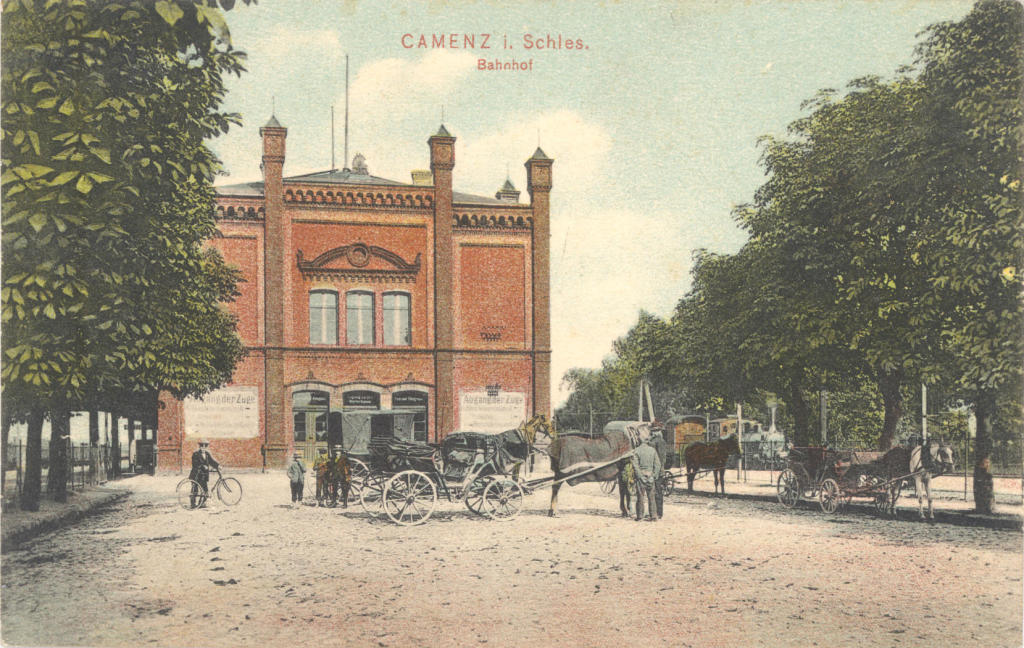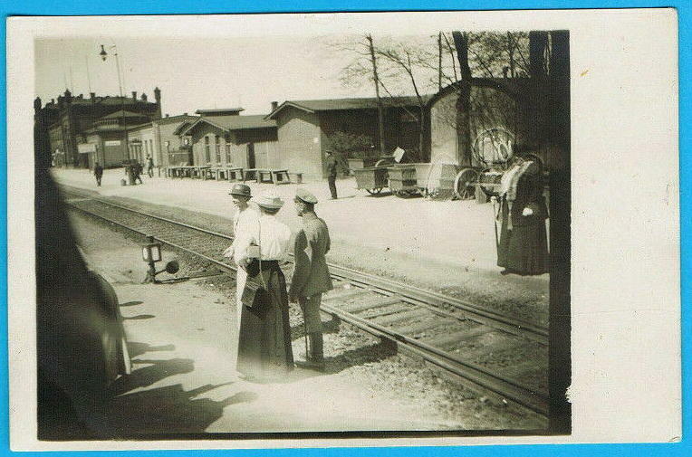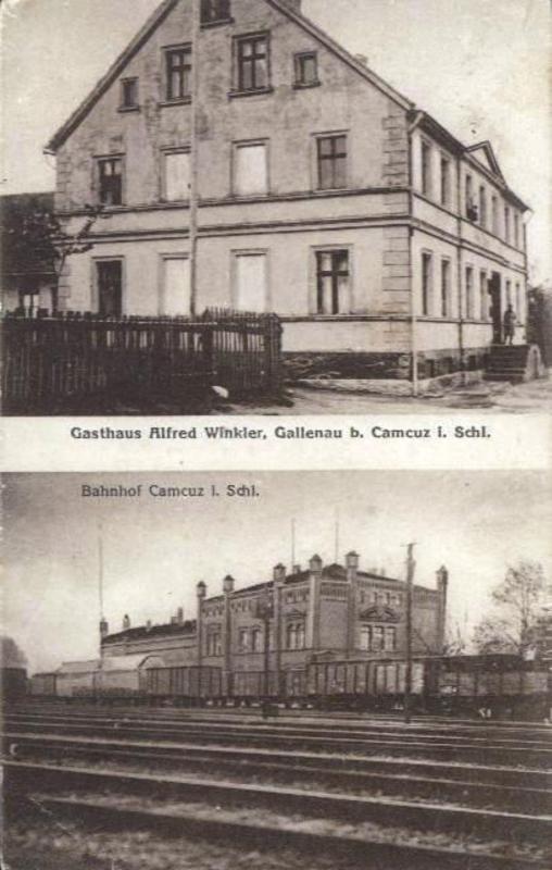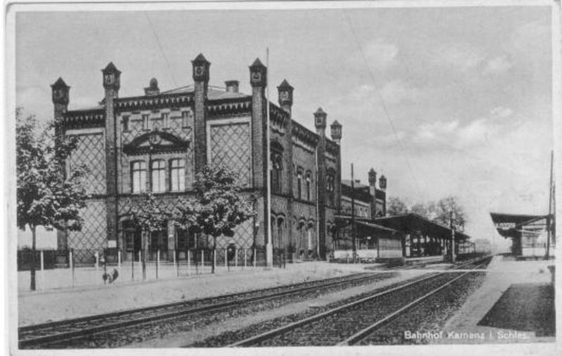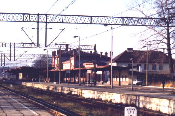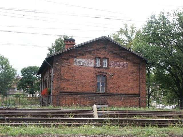 Niemiecka nazwa stacji na jednym z budynków przy torach.