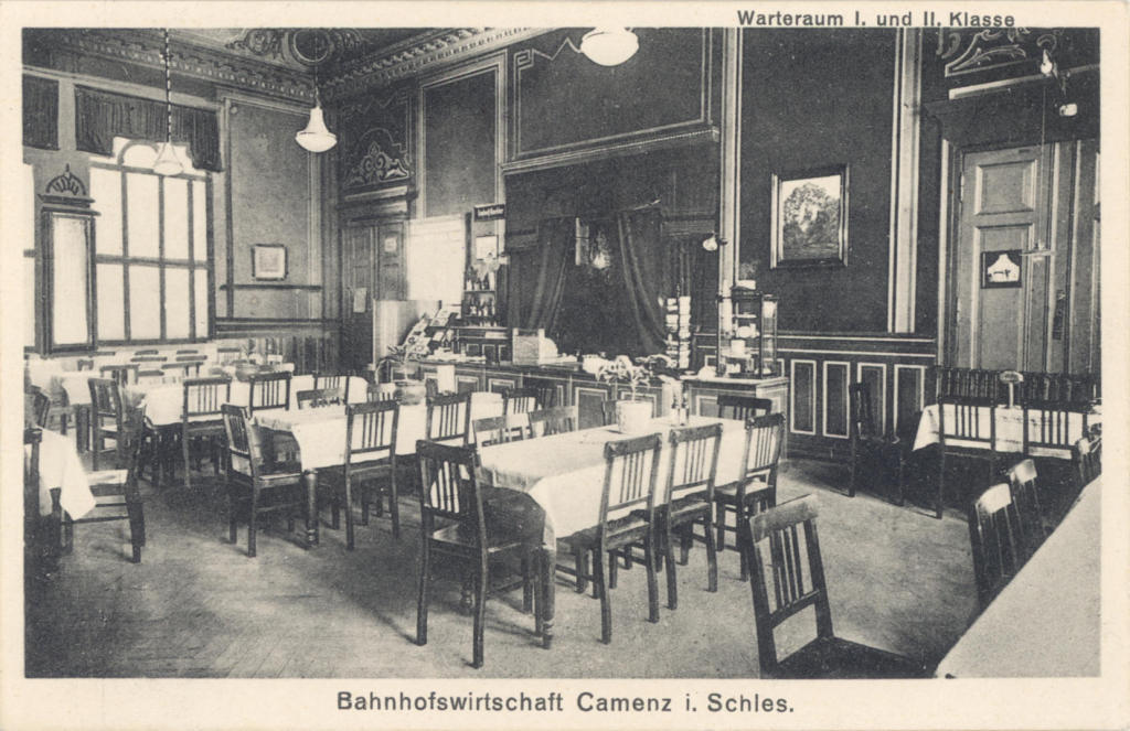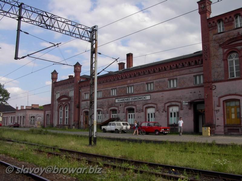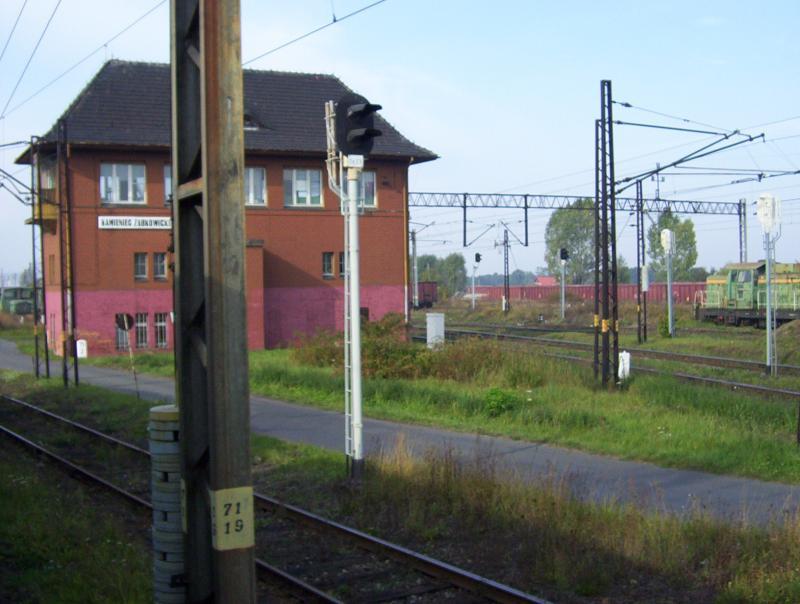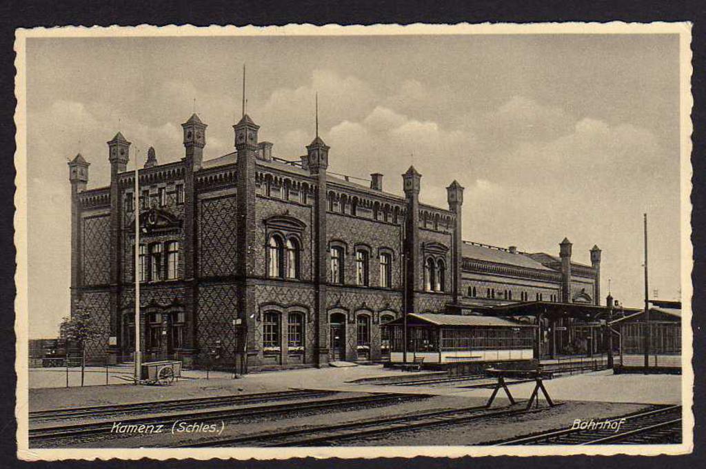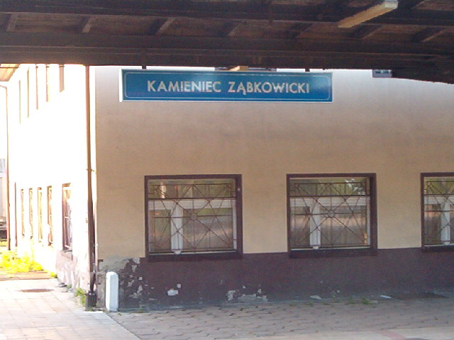 Stacja kolejowa Kamieniec Ząbkowicki. W tle, po lewej budynek dworca. Widok w kierunku zachodnim, od strony wjazdów ze Strzelina/Wrocławia, Paczkowa/Nysy i (dawniej) Złotego Stoku.