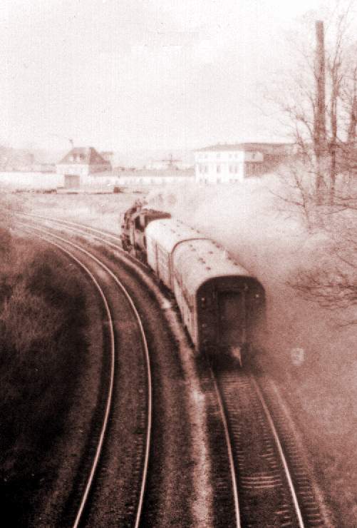 Pociąg z Nysy przy wjeździe do Kamieńca Ząbkowickiego. W tle widoczna lokomotywownia. Widok w kierunku północno-zachodnim: perony.