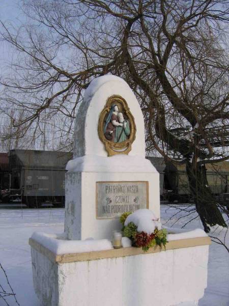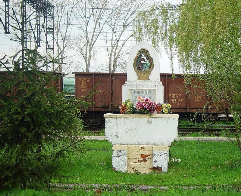 Świętej Katarzynie, swojej patronce, tablicą na jej kapliczce, tutejsi kolejarze zawierzają opiekę nad podróżującymi. Dlatego też na płaskorzeźbie Święta otula swymi ramionami zdrożonego podróżnego. Na marginesie - na tej wielkiej, opustoszałej stacji nie ma gdzie i do kogo podróżny się zwrócić i liczyć na pomoc.