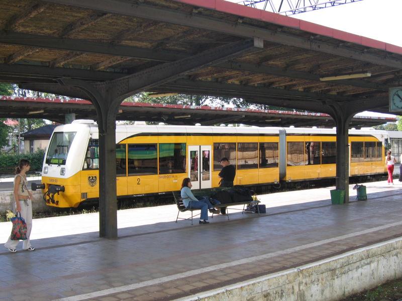 Szynobus SA109-003 na peronie 3 stacji w Kamieńcu Ząbkowickim. Na pierwszym planie peron 2. Widok w kierunku południowo-zachodnim; w prawo Nysa, Ząbkowice Śląskie, w lewo Strzelin/Wrocław, Paczków/Nysa, dawniej także Złoty Stok.