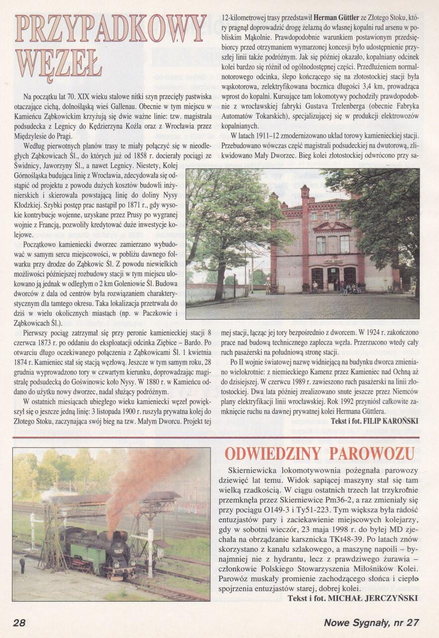 Skan artykułu z Nowych Sygnałów nr 27/98 z krótkim rysem historycznym węzła kolejowego w Kamieńcu Ząbkowickim oraz o gościu specjalnym w Skierniewicach.