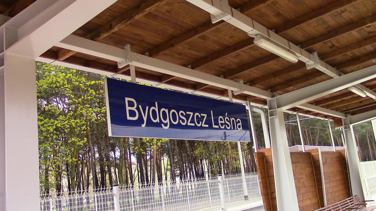 PKP Bydgoszcz Leśna. Tablica z nazwą na jedynym peronie tego przystanku.