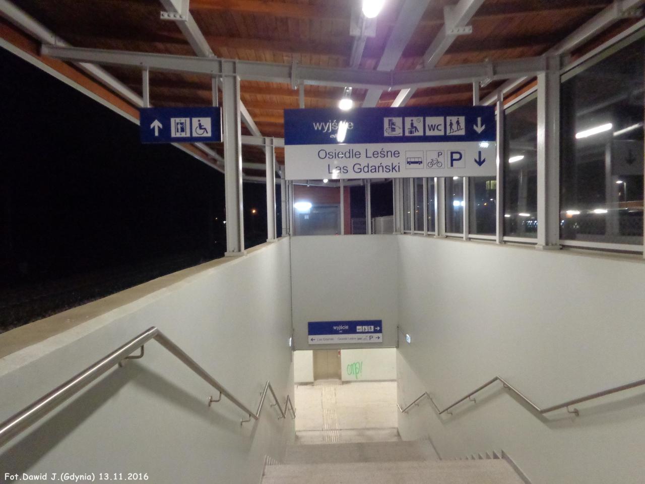 PKP Bydgoszcz Leśna. Przejście z budynku dworca na peron. W prawo Bydgoszcz Wschód, w lewo Bydgoszcz Główna i Maksymilianowo.