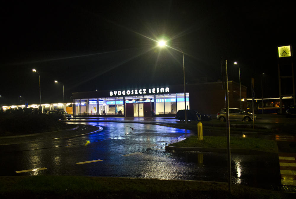 Stacja Bydgoszcz Leśna w deszczowy dzień. Widok w kierunku Bydgoszczy Wschód.
