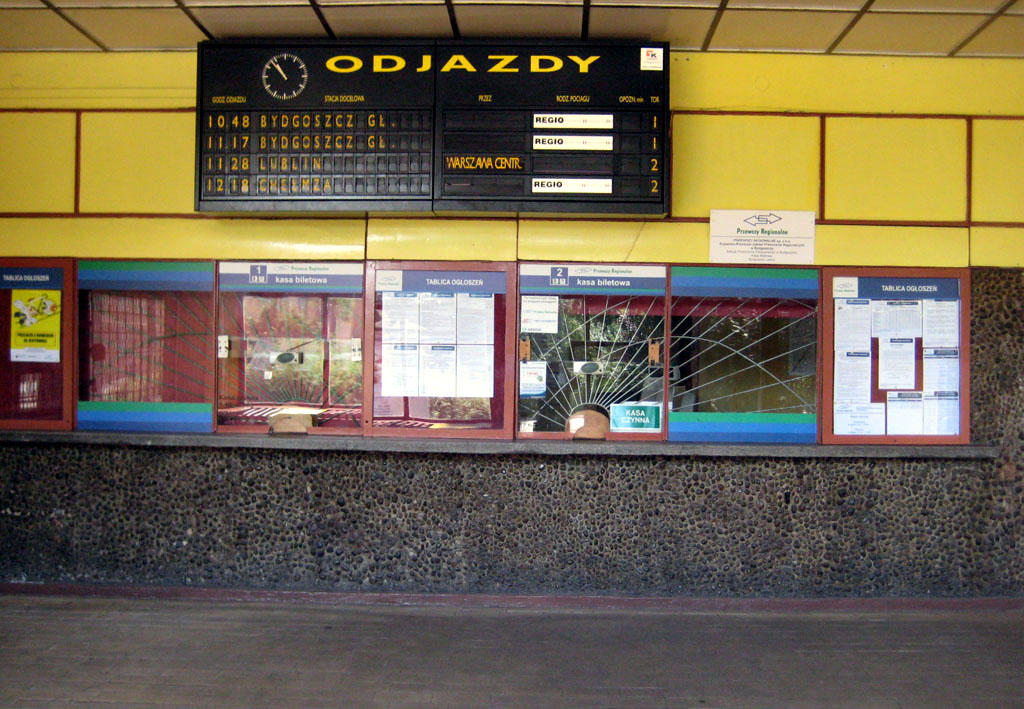 PKP Bydgoszcz Leśna. Kasy biletowe i tablica odjazdów w budynku dworcowym.