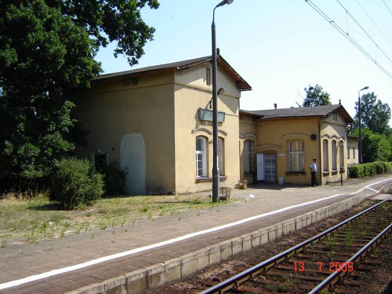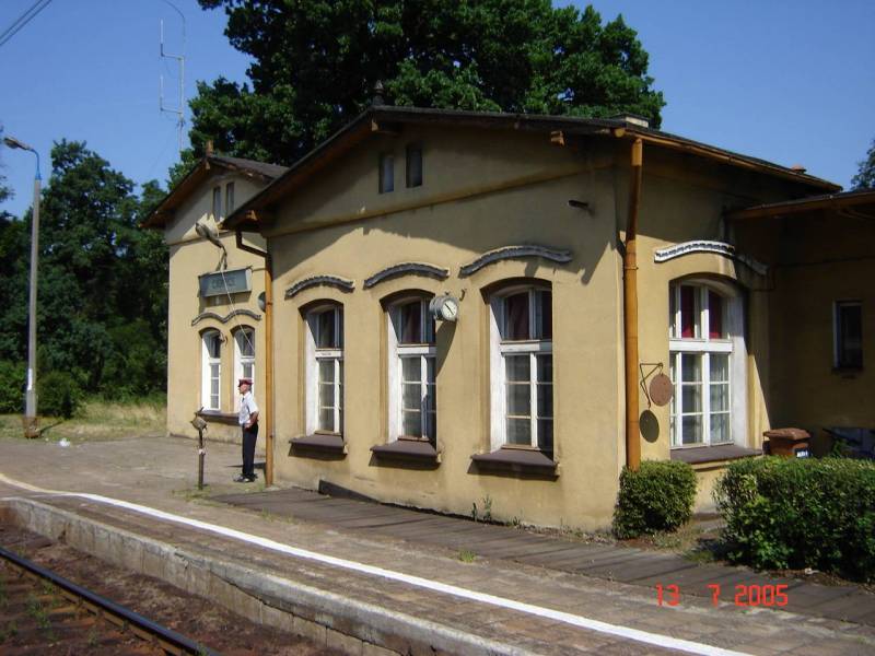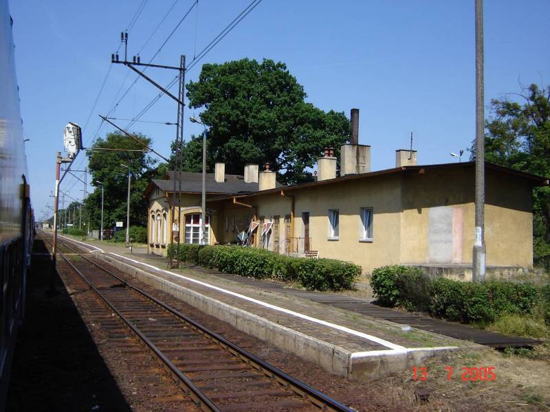 Widok na peron i budynek dworca od strony wjazdu z Bydgoszczy. W wysuniętej, centralnej części budynku mieści się nastawnia dysponująca.