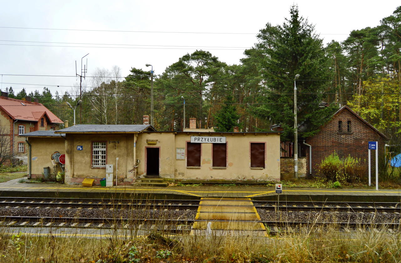 Przyłubie, km 131,1. Dworzec; skrót "Pb" - pozostałość po posterunku odstępowym.