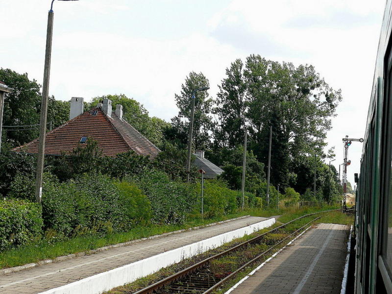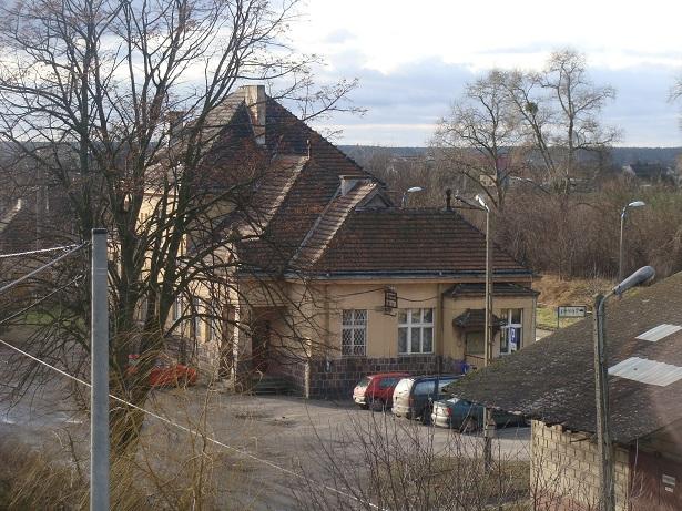 Budynek dworcowy widoczny od strony torów. W budynku dworcowym znajduje się pomieszczenie nastawni "Sr". Widok w kierunku Wierzchucina/Gdyni Głównej.