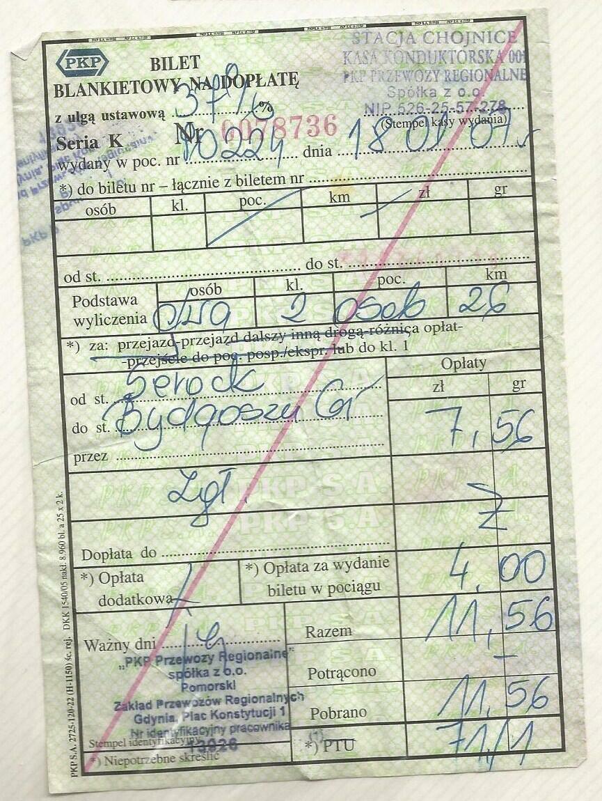 Bilet ze stacji Serock do Bydgoszczy, wydany w pociągu.