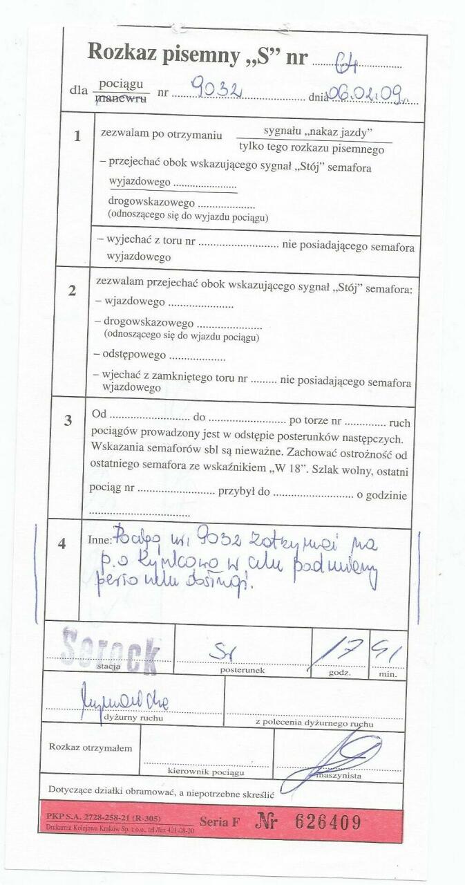 Rozkaz pisemny "S" dla pociągu 9032 na zatrzymanie się na posterunku Rynkowo, w celu wysadzenia dyżurnej ruchu.