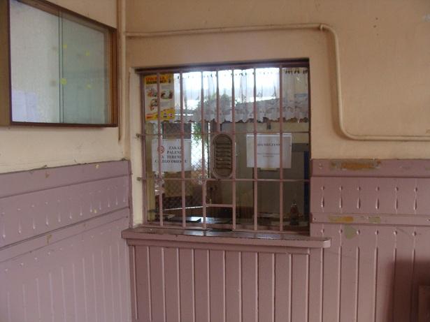 Wnętrze budynku dworcowego. Poczekalnia dla podróżnych. Nieczynne okienko kasy biletowej.