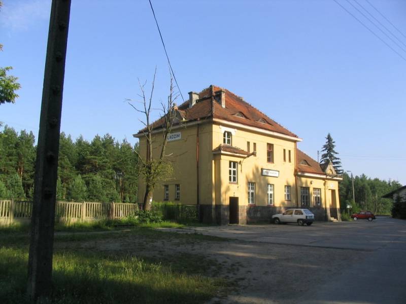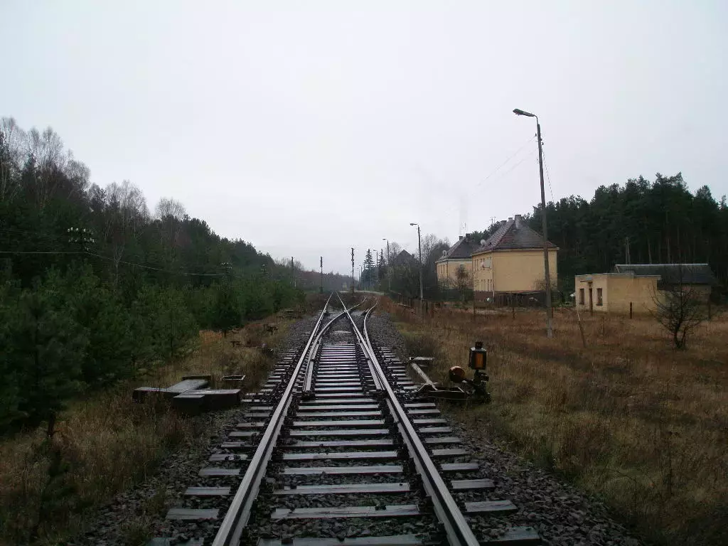 Widok na dawną stację w kierunku Maksymilianowa/Bydgoszczy. Z prawej perony i (poza kadrem) dworzec.