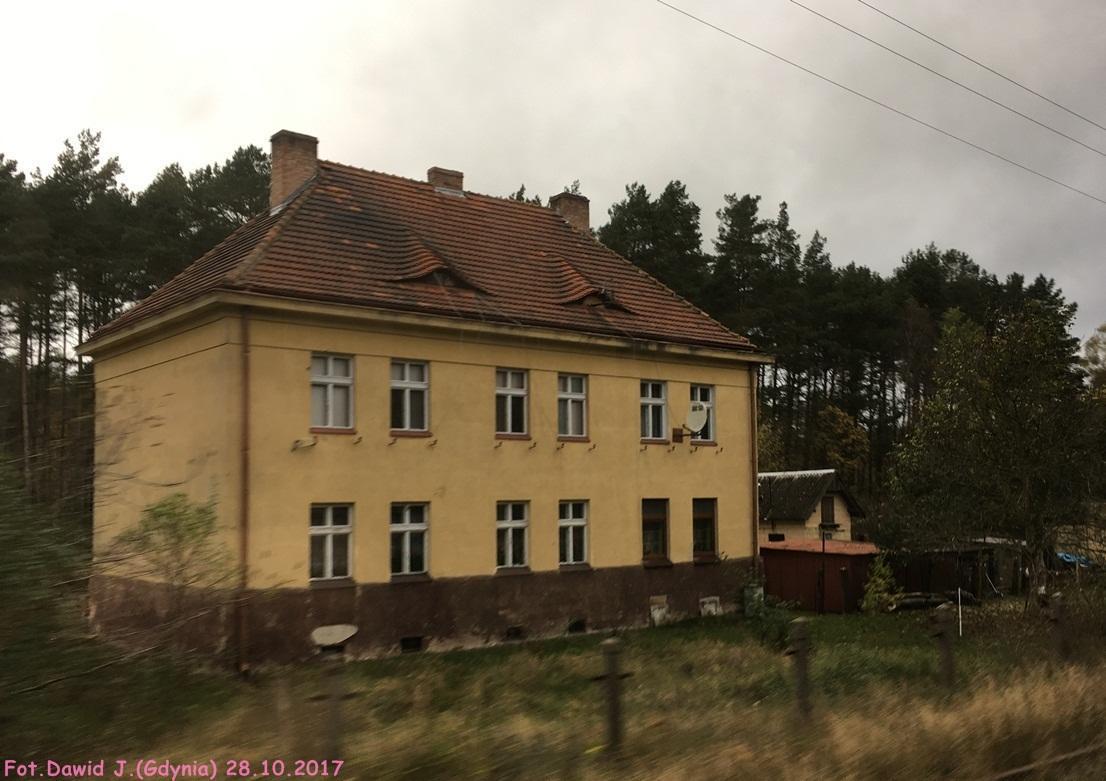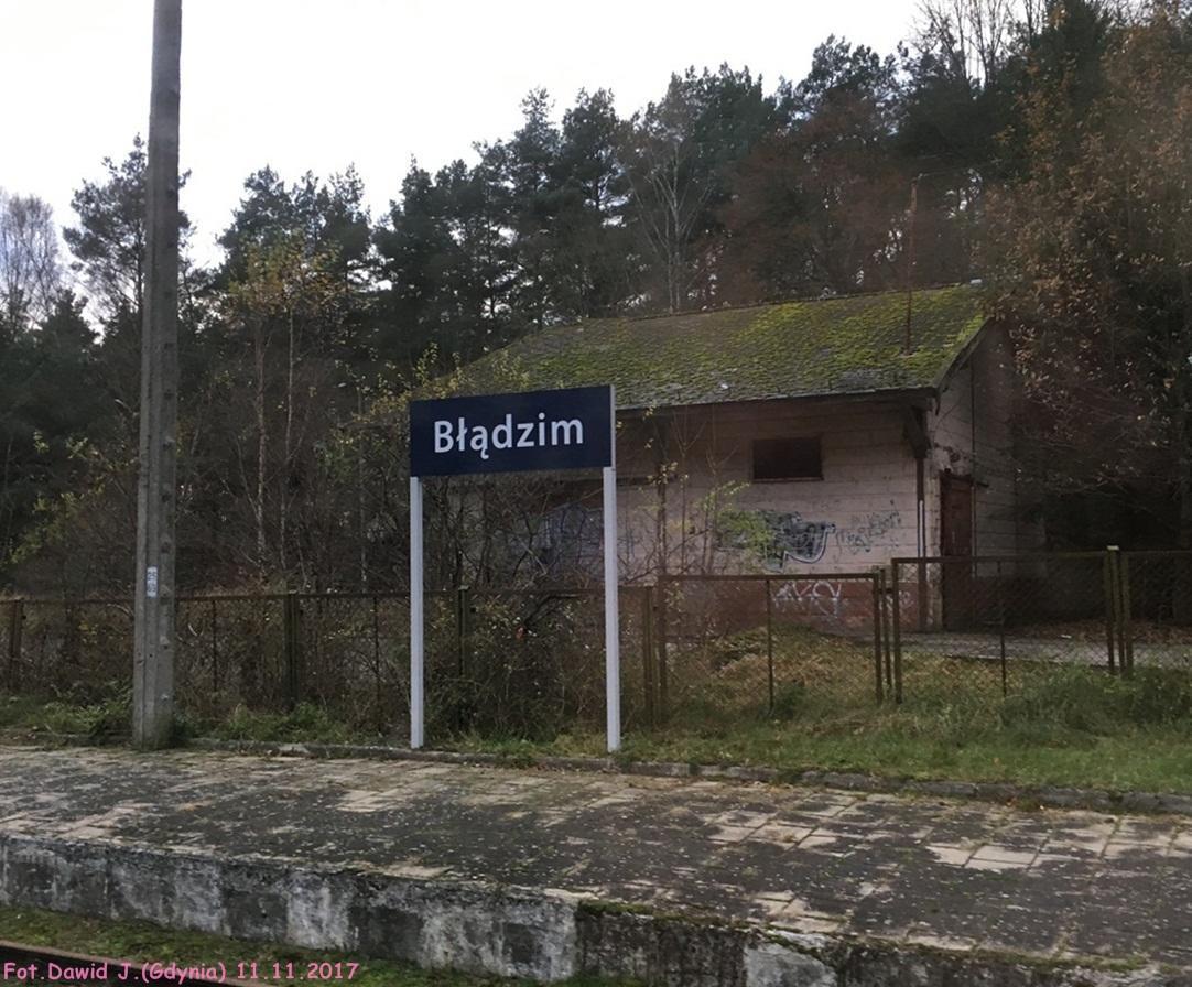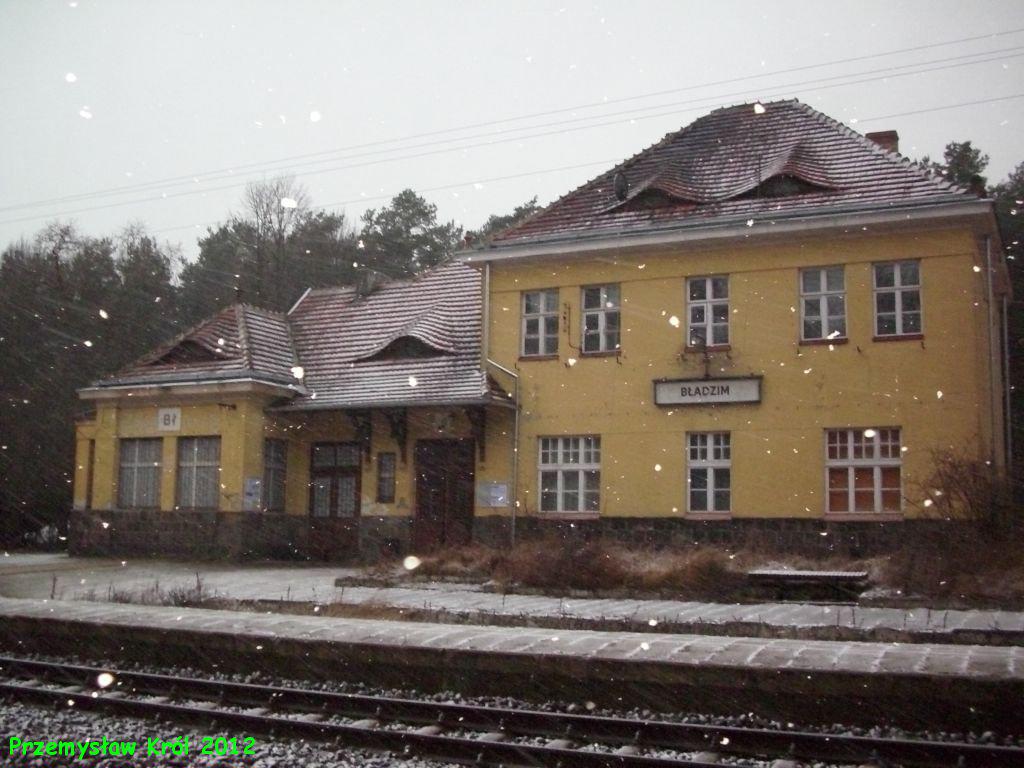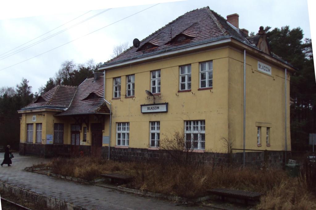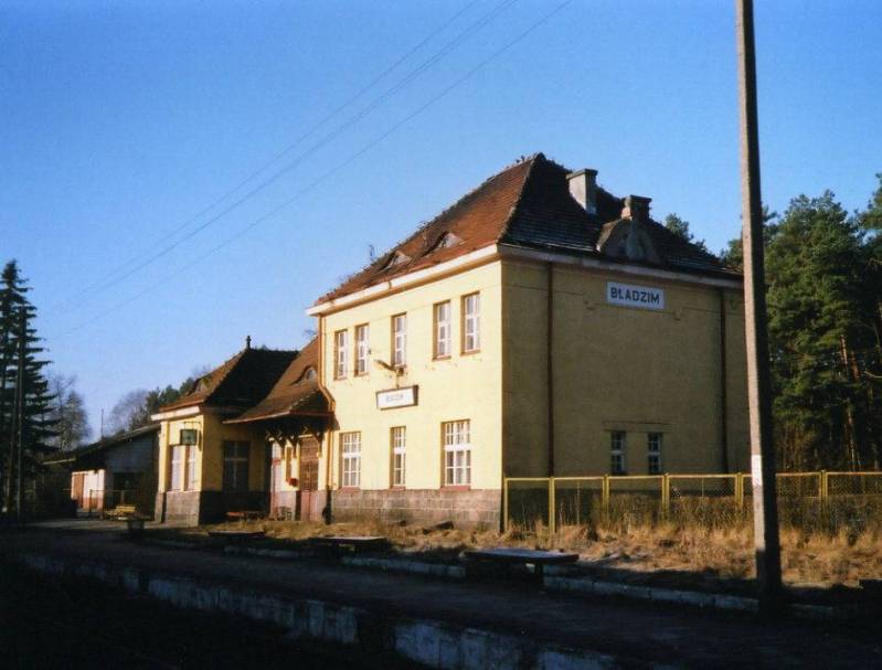 Kolejowy budynek mieszkalny (Błądzim 3) i pobliski budynek gospodarczy. Obiekty widoczne od strony torów. W lewo Maksymilianowo/Bydgoszcz Główna, w prawo Wierzchucin/Gdynia Główna.