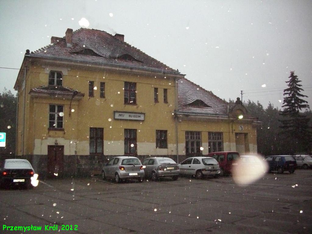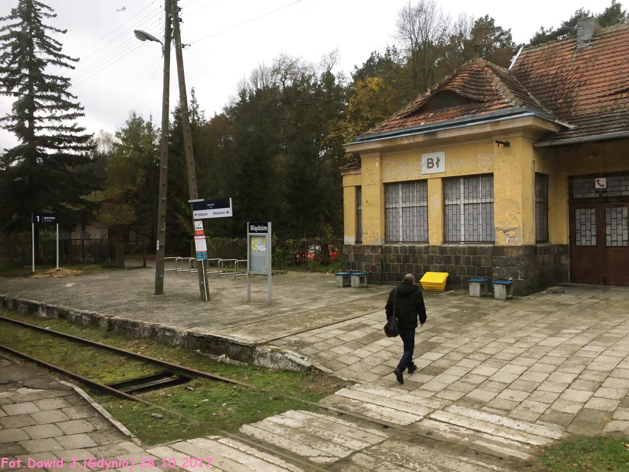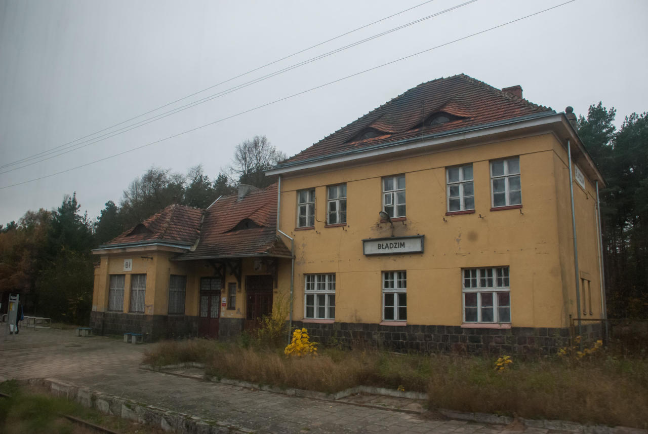 Kolejowy budynek mieszkalny (Błądzim 3) i pobliski budynek gospodarczy. Obiekty widoczne od strony torów. W lewo Maksymilianowo/Bydgoszcz Główna, w prawo Wierzchucin/Gdynia Główna.