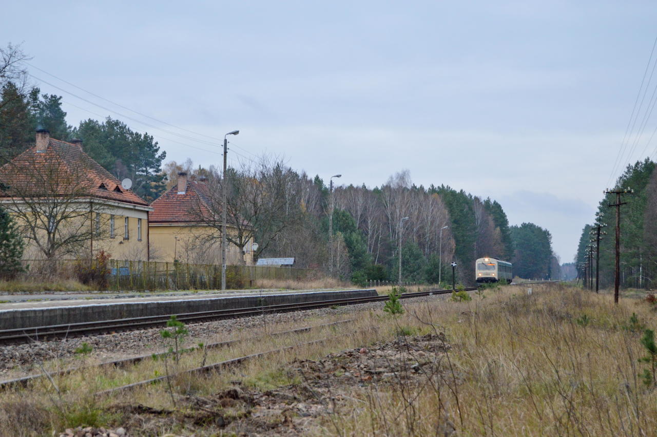 MRD 4268 z poc. 55166 do Bydgoszczy Gł. Z lewej budynek dworca, który w parterowej części mieścił nastawnię dysponującą. W lewo Maksymilianowo/Bydgoszcz, w prawo Wierzchucin/Kościerzyna.