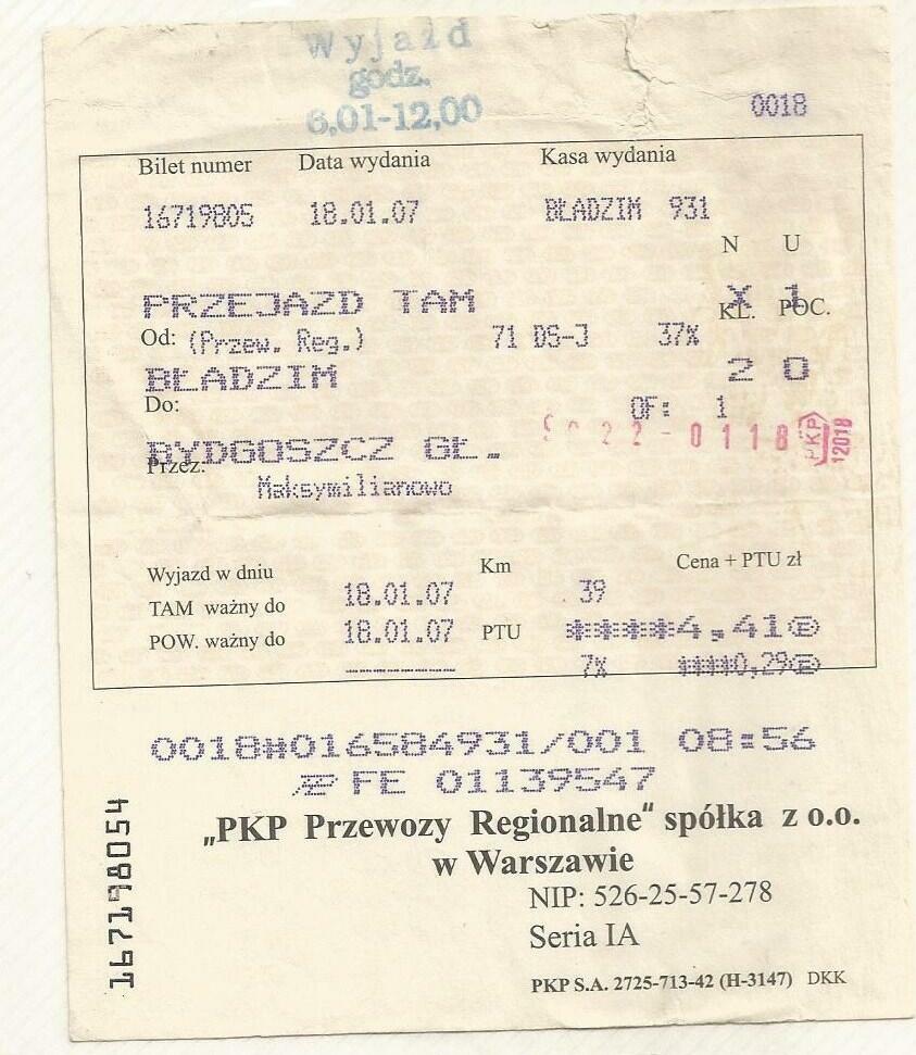Bilet wydany w kasie biletowej stacji Błądzim. Obecnie od wielu lat kasa jest tam nieczynna.
