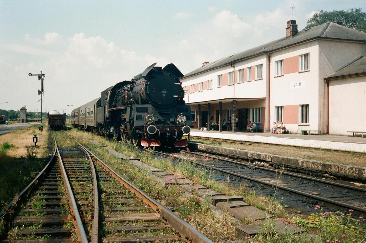 Stacja Śrem: z lewej strony - parowóz Ol49-6 z pociągiem M 33532 relacji Śrem - Jarocin w oczekiwaniu na odjazd, z prawej strony - parowóz Ol49-90 z pociągiem M 33529 relacji Śrem Odlewnia - Czempiń wjeżdża na stację. W lewo - kierunek Czempiń, w prawo - kierunek Mieszków/Jarocin.