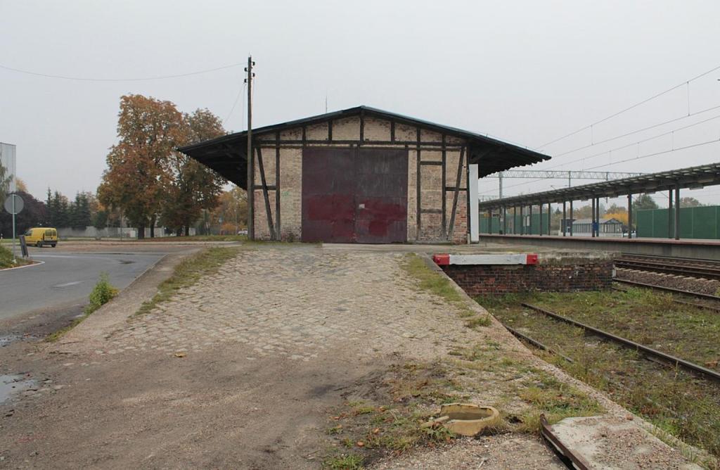 Widok od strony peronów na budynek stacji jeszcze ze starym magazynem.