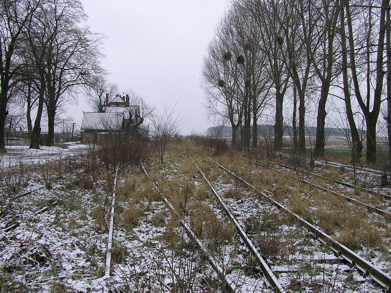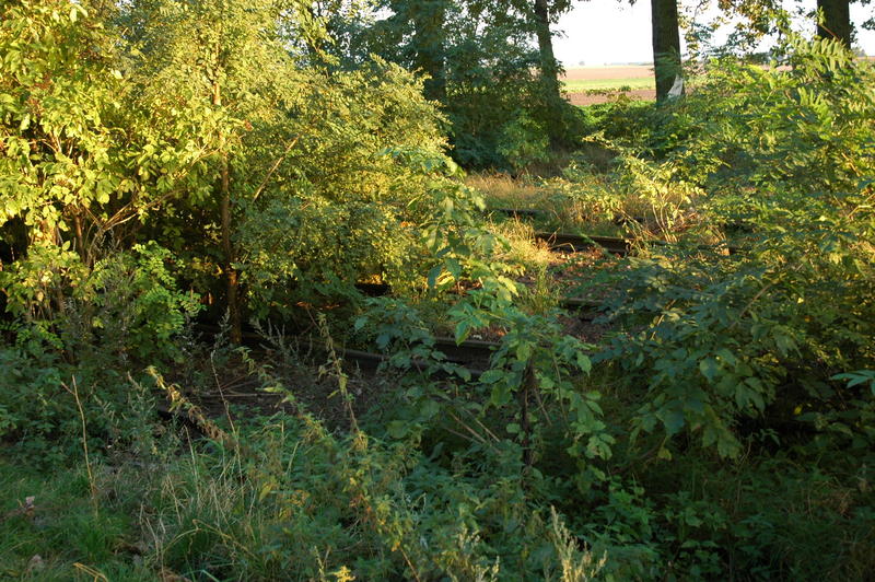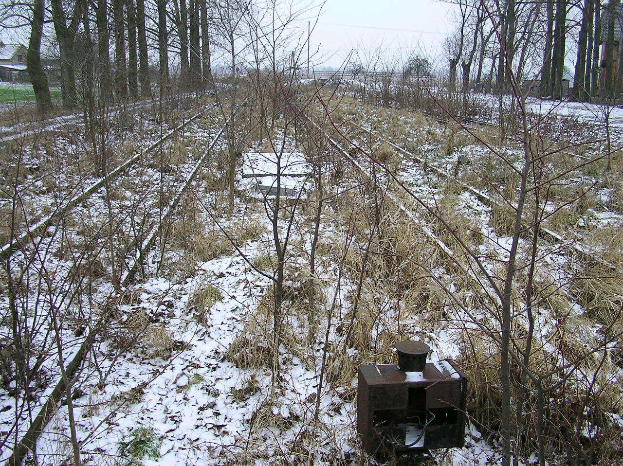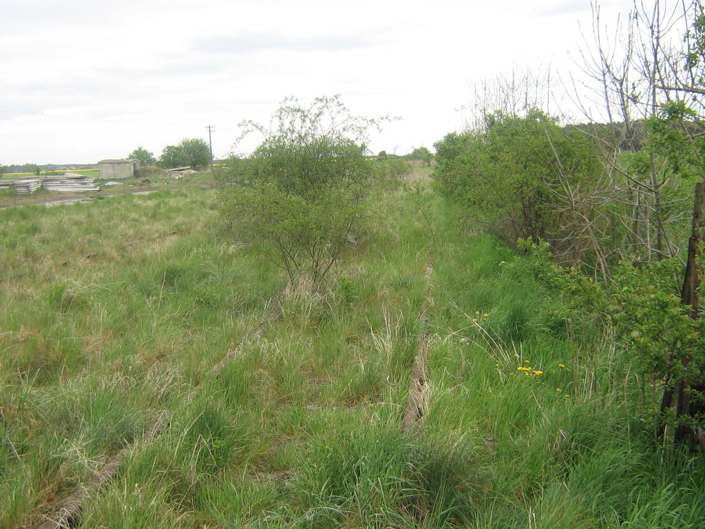 Zarastające tory i miejsce po żurawiu wodnym. Widok w kierunku Śremu. Z prawej droga dojazdowa, budynki gospodarcze i niewidoczna wieża wodna.