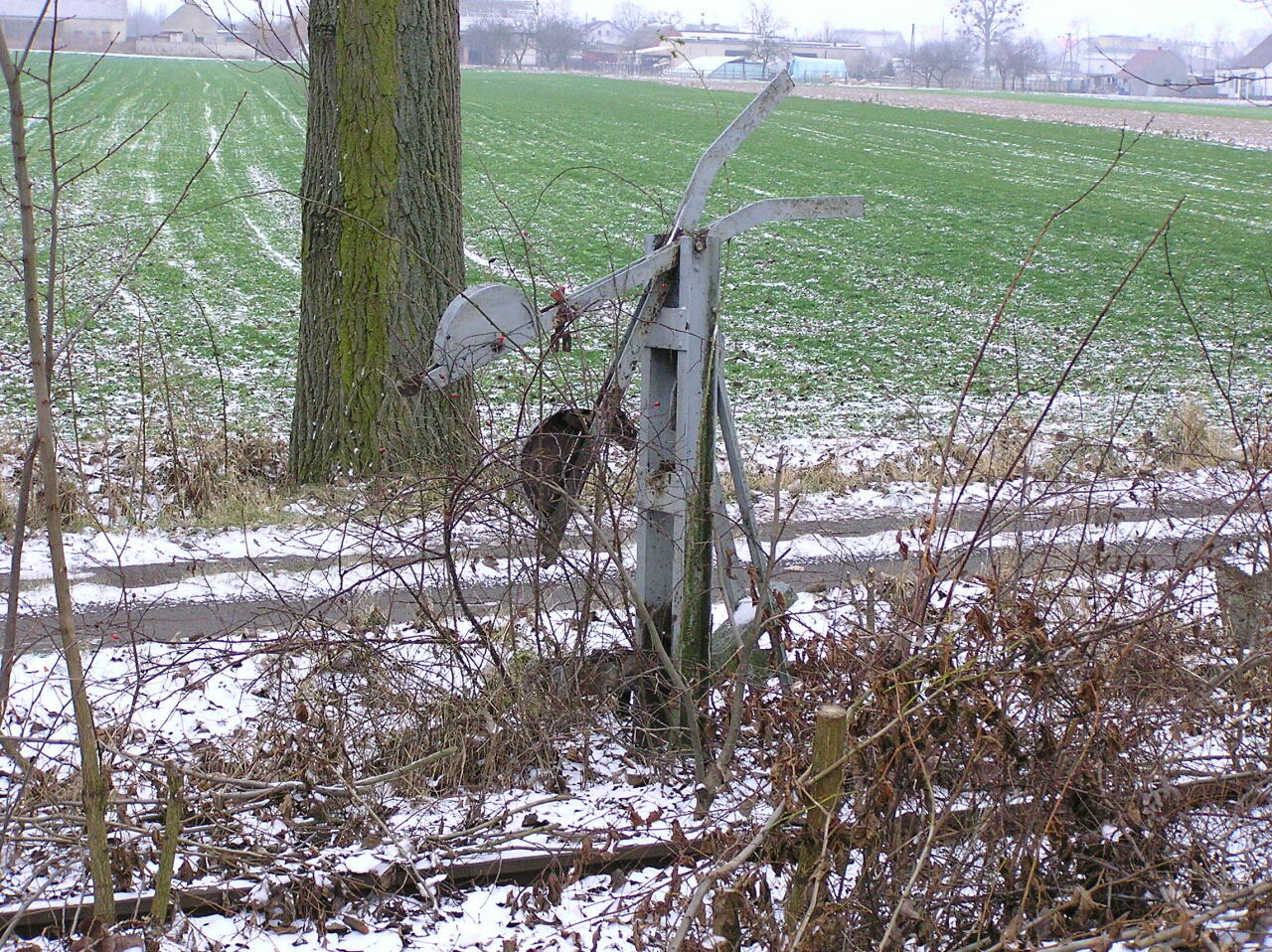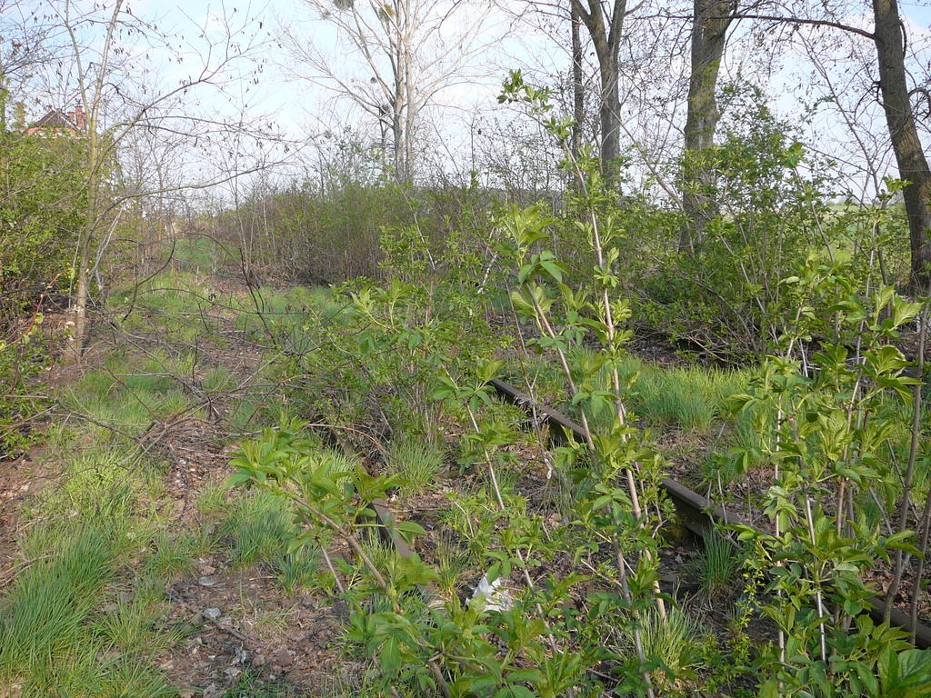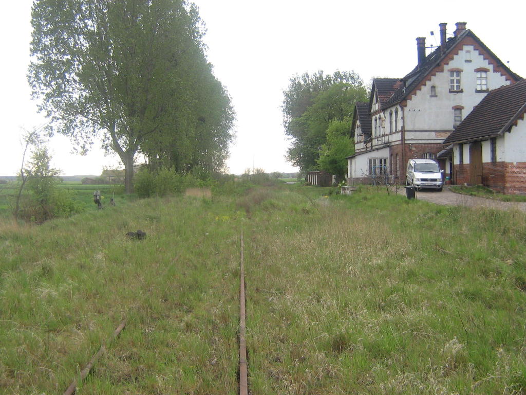 Zarastające tory i miejsce po żurawiu wodnym. Widok w kierunku Śremu. Z prawej droga dojazdowa, budynki gospodarcze i niewidoczna wieża wodna.