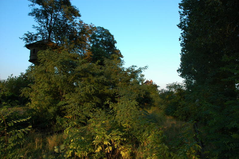 W tym gąszczu są tory prowadzące na perony na stacji w Książu, za krzakami widoczny dach budynku dworca a na lewo wieża wodna.