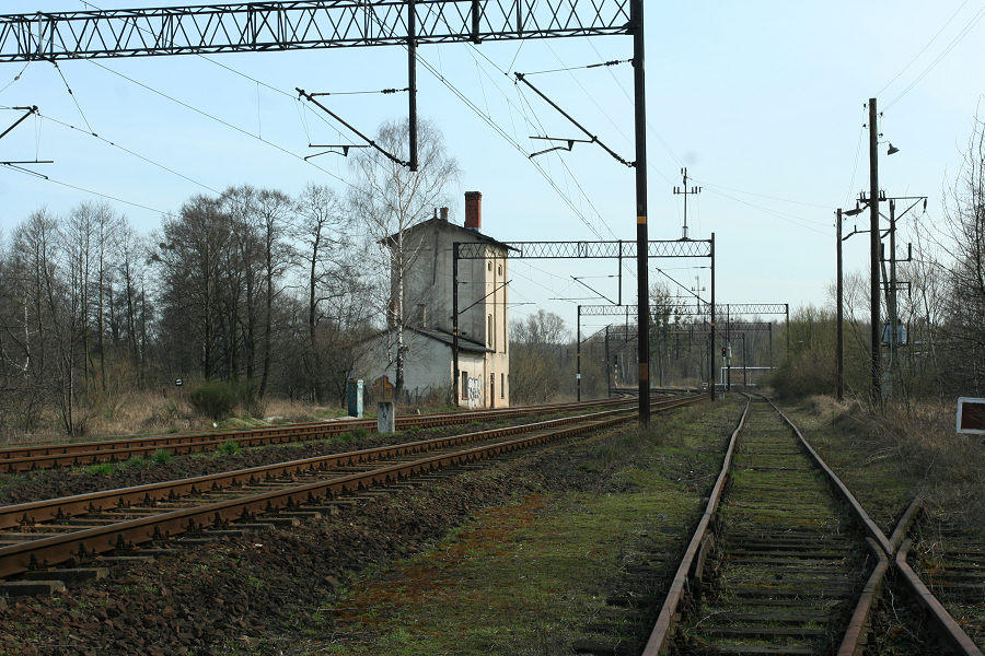 Widok na perony i budynek dworca z przybudówką nastawni od strony wjazdu z Grabowna Wielkiego/Oleśnicy. Kierunek północny.