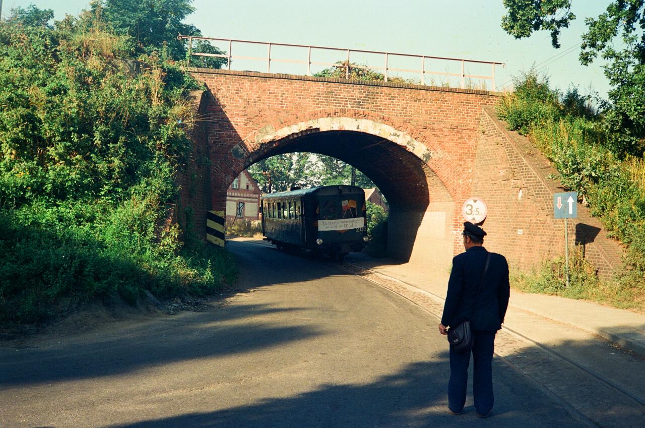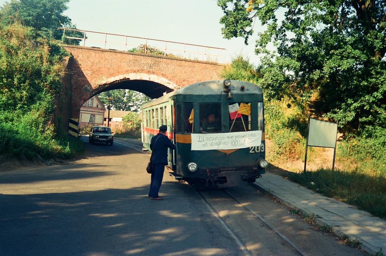 Wskaźnik WW1 (km 72,781- 72,800 linii Trzebnica Gaj - Sulmierzyce) - pociąg MM 607 relacji Milicz Wąsk. - Sulmierzyce, obsługiwany wagonem spalinowym MBxd1-203, przejeżdża w Miliczu ulicą Kolejową, pod wiaduktem linii normalnotorowej nr 281 Oleśnica - Chojnice. Widok w kierunku Trzebnicy Gaj.