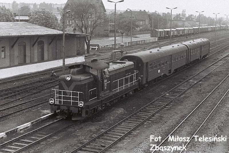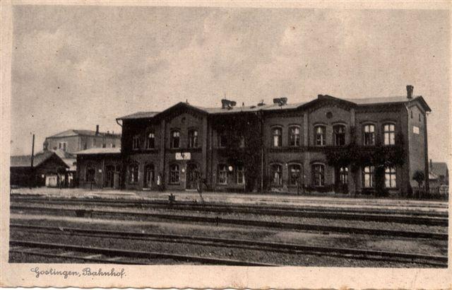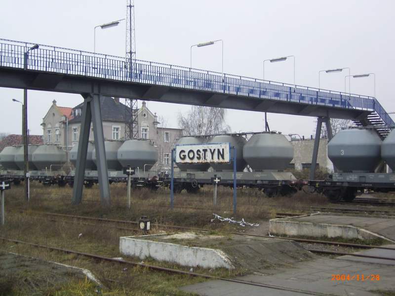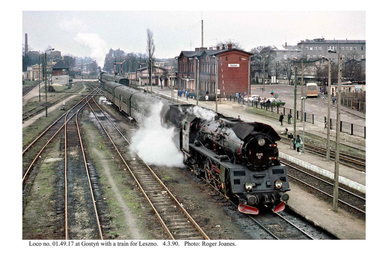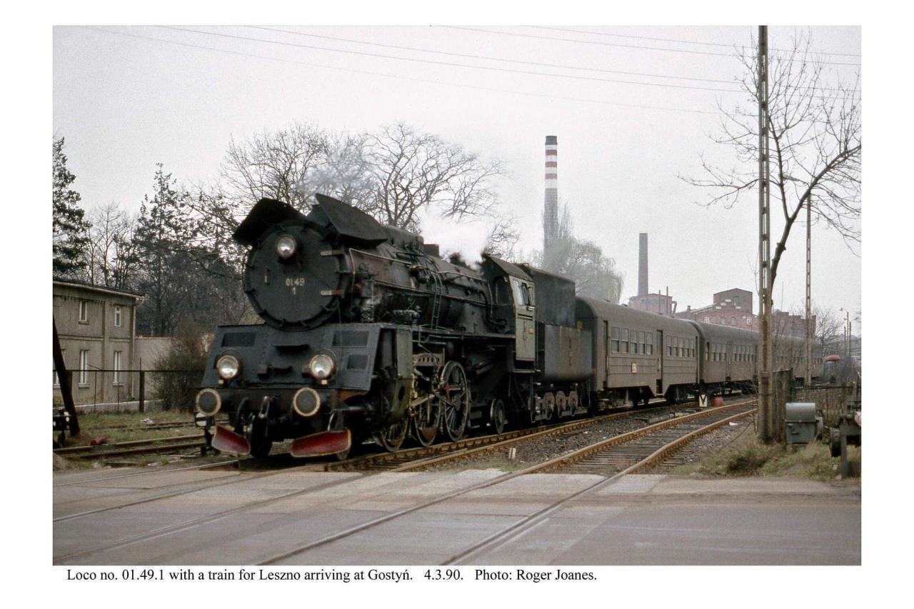 Ol49 z pociągiem osobowym z Jarocina do Leszna wjeżdża na stację Gostyń. Na pierwszym planie przejazd kolejowy przez ul. Poznańską. W tle kominy cukrowni. Widok w kierunku wschodnim - wyjazdy na Jarocin, Krobię i Koźmin, przez Piaski Wielkopolskie.