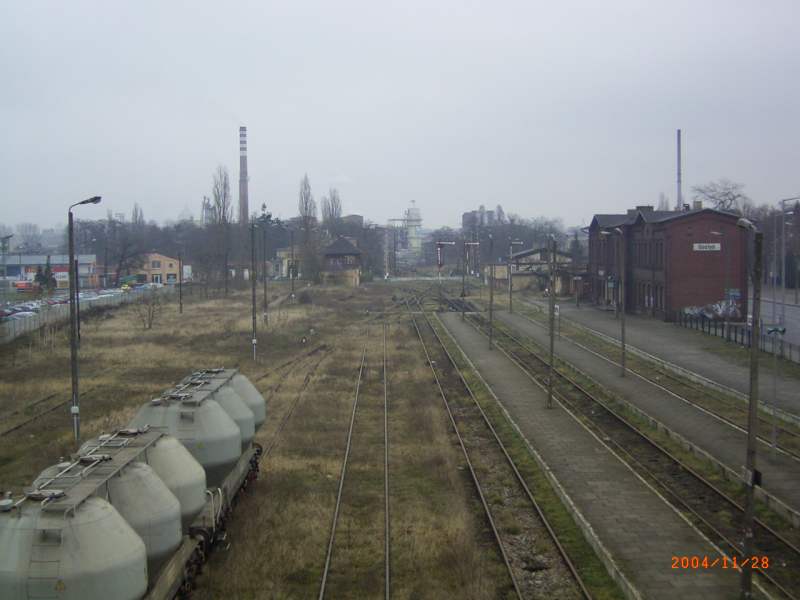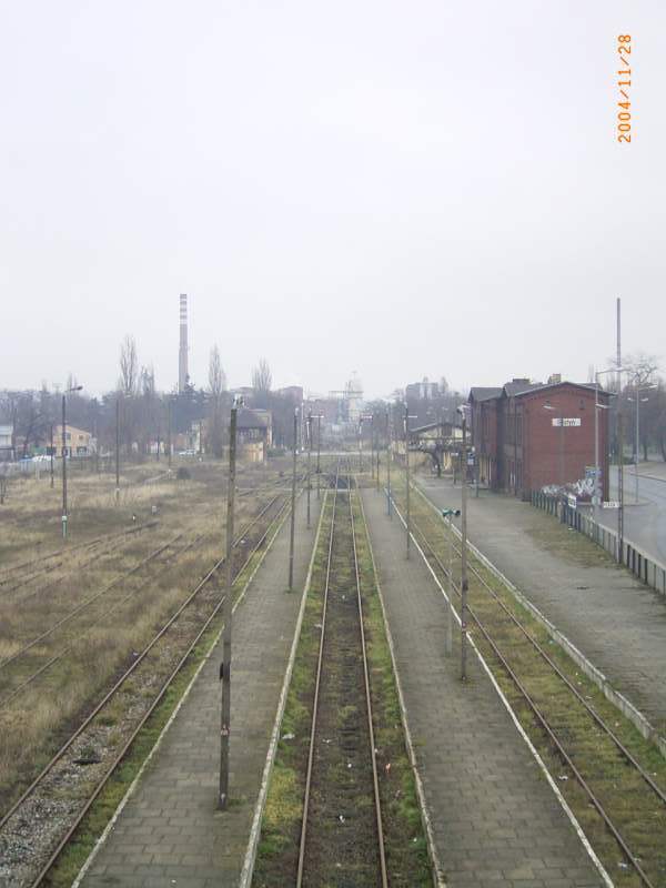 Widok na perony z kładki nadziemnej, w kierunku wschodnim - Jarocin, Krobia i (dawniej) Koźmin, przez Piaski Wielkopolskie. W tle nastawnia dysponująca, stojąca przy przejeździe kolejowym z ul. Poznańską oraz komin cukrowni "Gostyń".