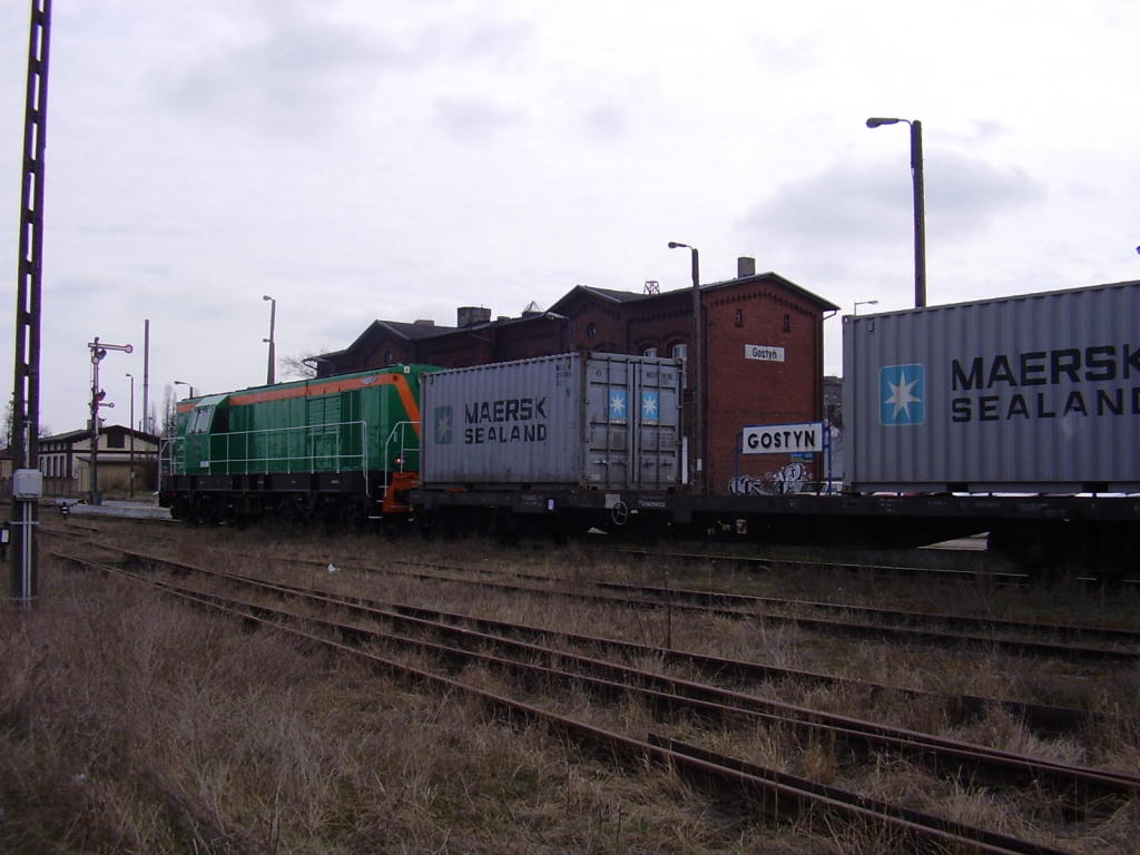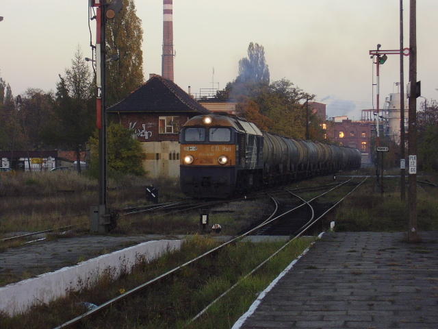 ST44 CTL Rail z ładunkiem dla Cukrowni. Widok w kierunku wschodnim - Jarocin, Krobia, dawniej także Koźmin, przez Piaski Wielkopolskie. Z lewej nastawnia dysponująca Gs. W tle przejazd kolejowy przez ul. Poznańską i wspomniana Cukrownia Kościan.