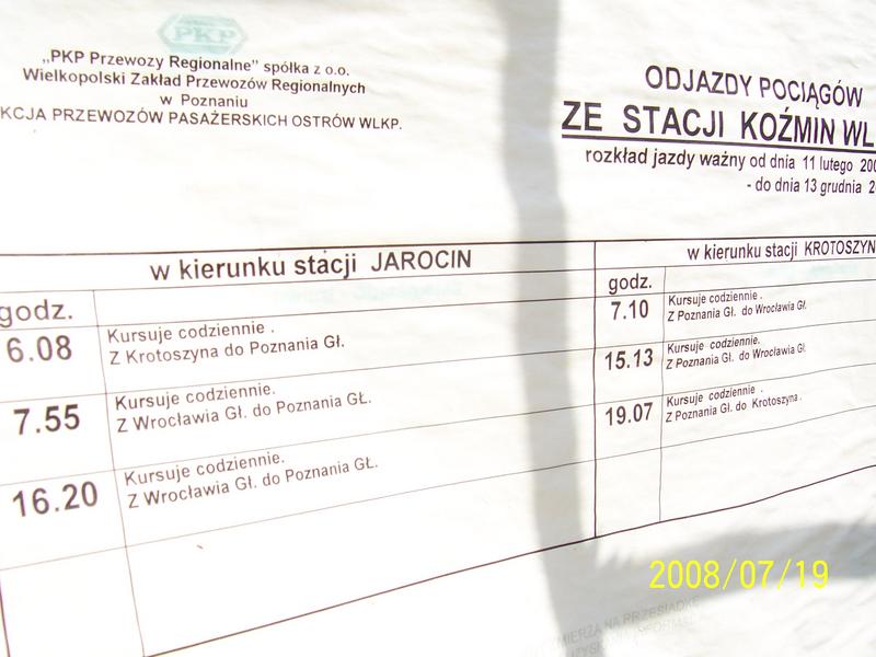 Miły widok. Stacja przeżywa niespodziewany rozkwit. Oblężenie pociągami towarowymi jest spowodowane transportem kruszywa (głównie budowa infrastruktury drogowej) z południa na północ kraju. Prawdopodobnie wszystkie czynne (minimum 3) tory są używane. W tle budynek dworca. Widok w kierunku wschodnim: w lewo Jarocin, w prawo Krotoszyn, dawniej także Piaski Wielkopolskie/Gostyń.