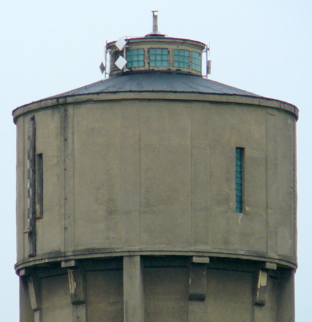 Koźmin Wielkopolski. Część zbiornikowa wieży wodnej ze wskaźnikiem poziomu wody w zbiorniku wieży.