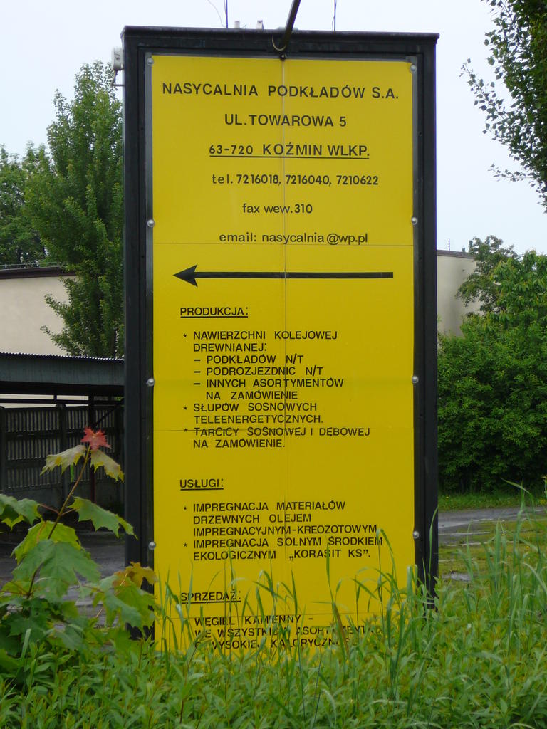 Koźmin. Tabliczka na ogrodzeniu Nasycalni Podkładów.