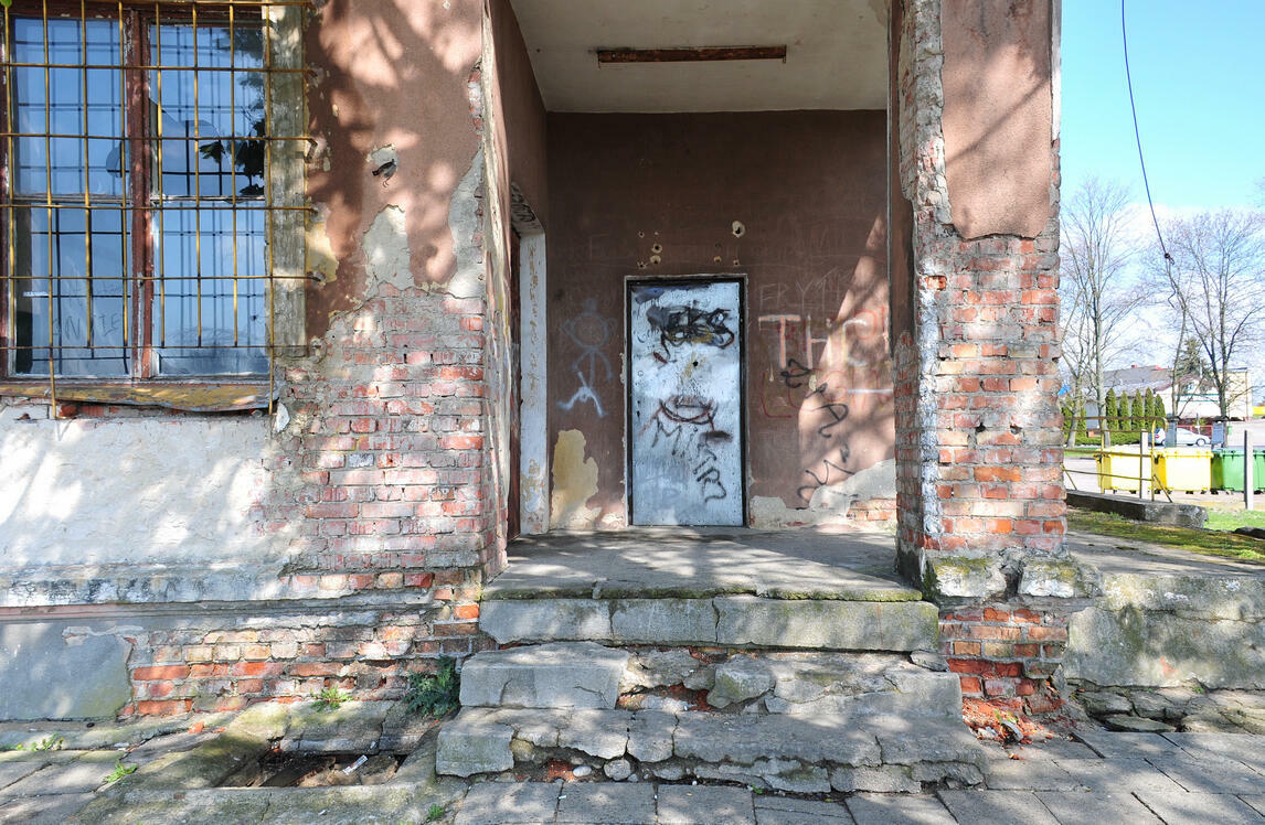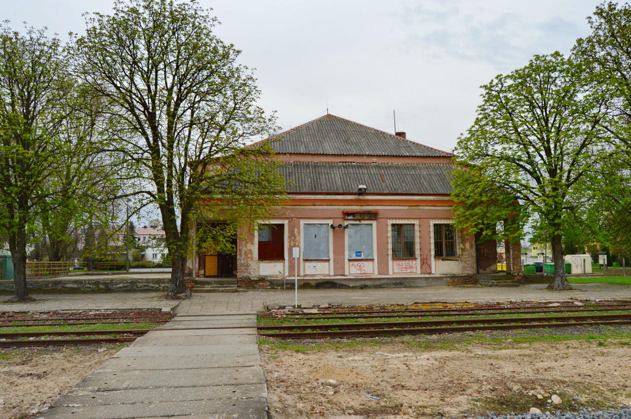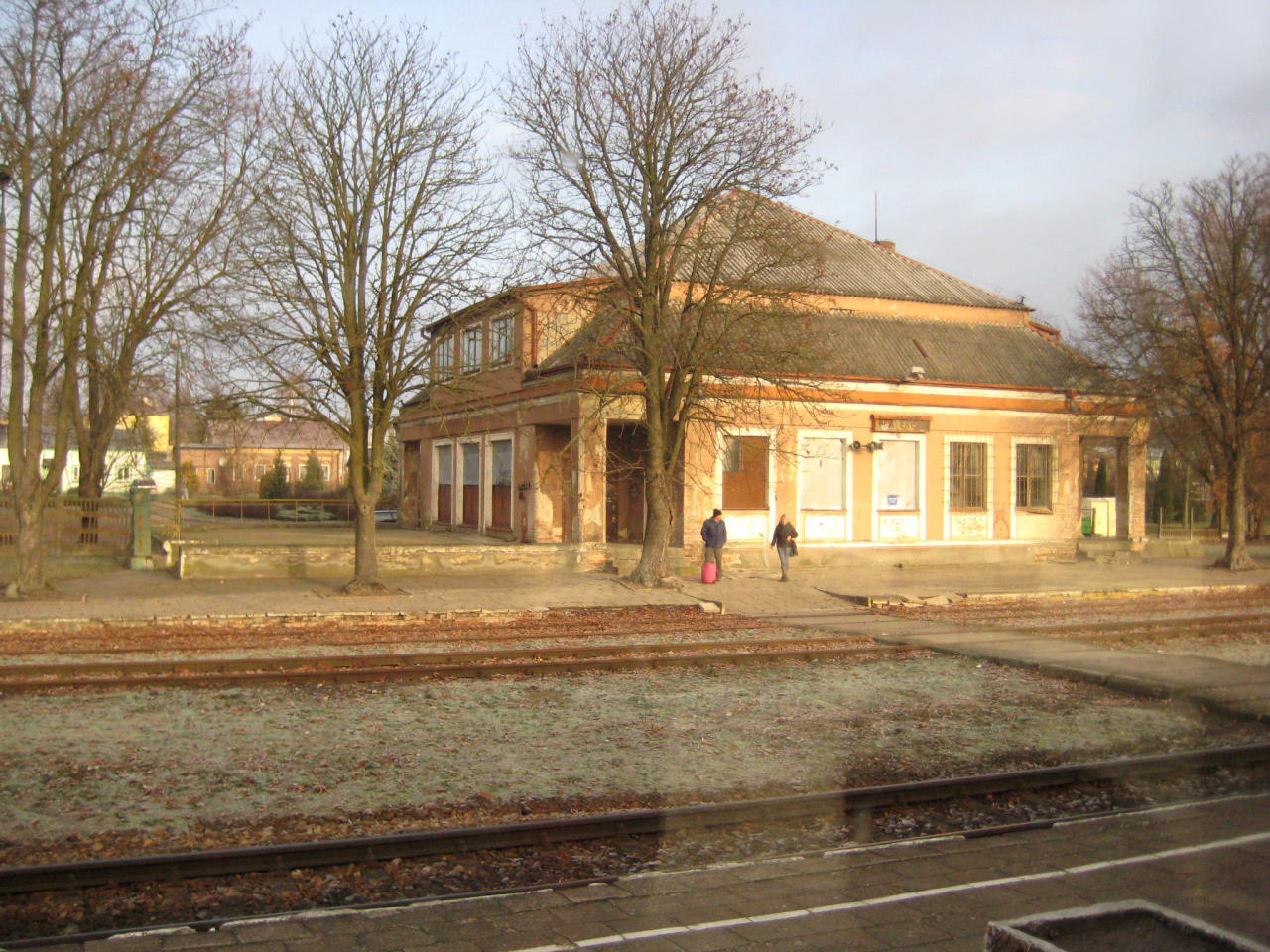 Widok od strony torowiska na nieczynny i powoli rozpadający się budynek dworca.