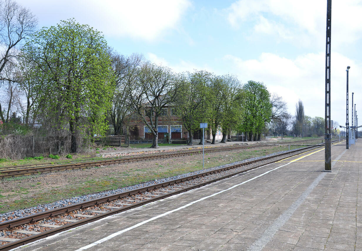 Ukryty za pierwszymi zielonymi listkami kasztanowców budynek dworca. Widoczne przejście dla pieszych na peron. Widok w kierunku Czeremchy.
