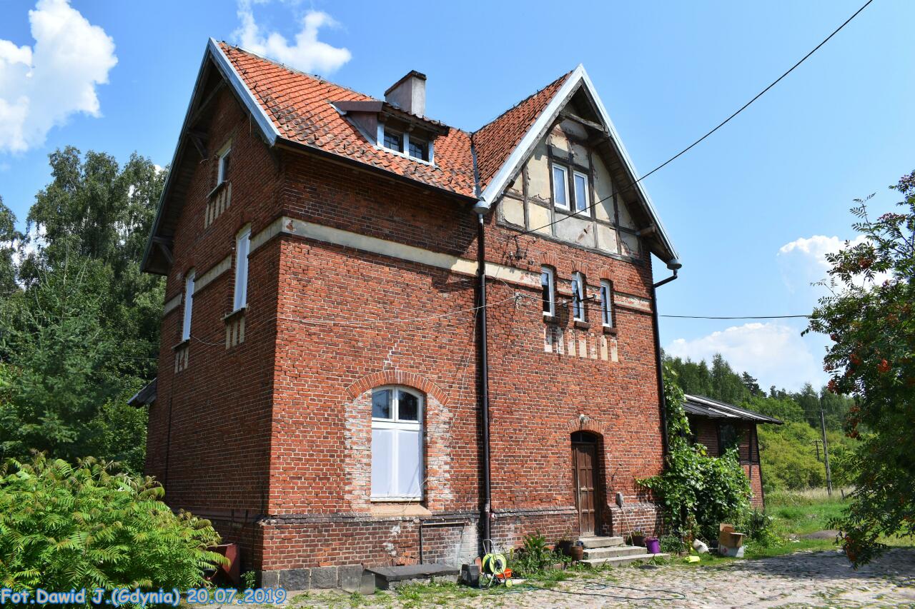 Budynek dworcowy widoczny od strony torów. Widok w kierunku Mikołajek, Czerwonki, Olsztyna Głównego. Za budynkiem dworcowym znajduję się budynek WC, pobliski budynek gospodarczy, kolejowy budynek mieszkalny.