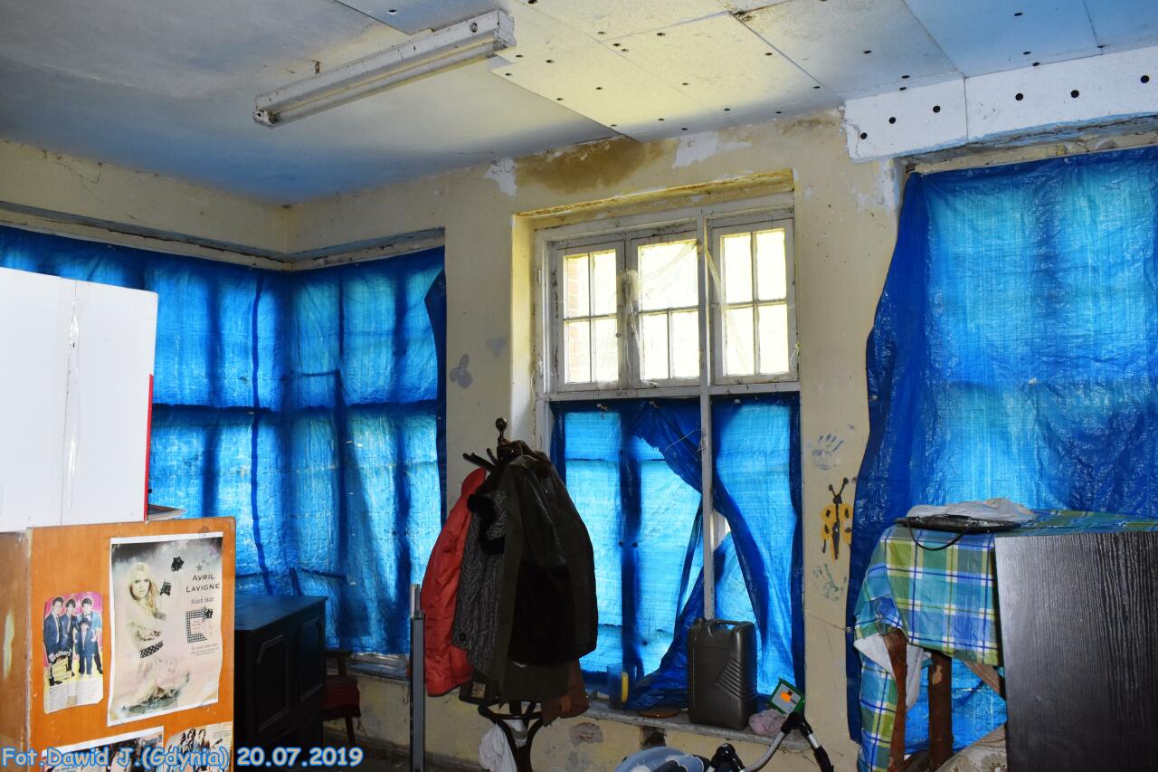 Wnętrze budynku dworcowego. Dawne pomieszczenie dyżurnego ruchu. Dawne okienko najprawdopodobniej kasy bagażowej(po prawej stronie było okienko kasy biletowej gdzie można było kupować bilety od drugiej strony-poczekalni która obecnie całkowicie zmieniła przeznaczenie i wystrój na pokój mieszkalny).