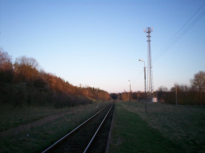 Widok z peronu w kierunku Mikołajek, Czerwonki, Olsztyna Głównego. Kolejowy budynek mieszkalny i pobliski budynek gospodarczy po lewej stronie.