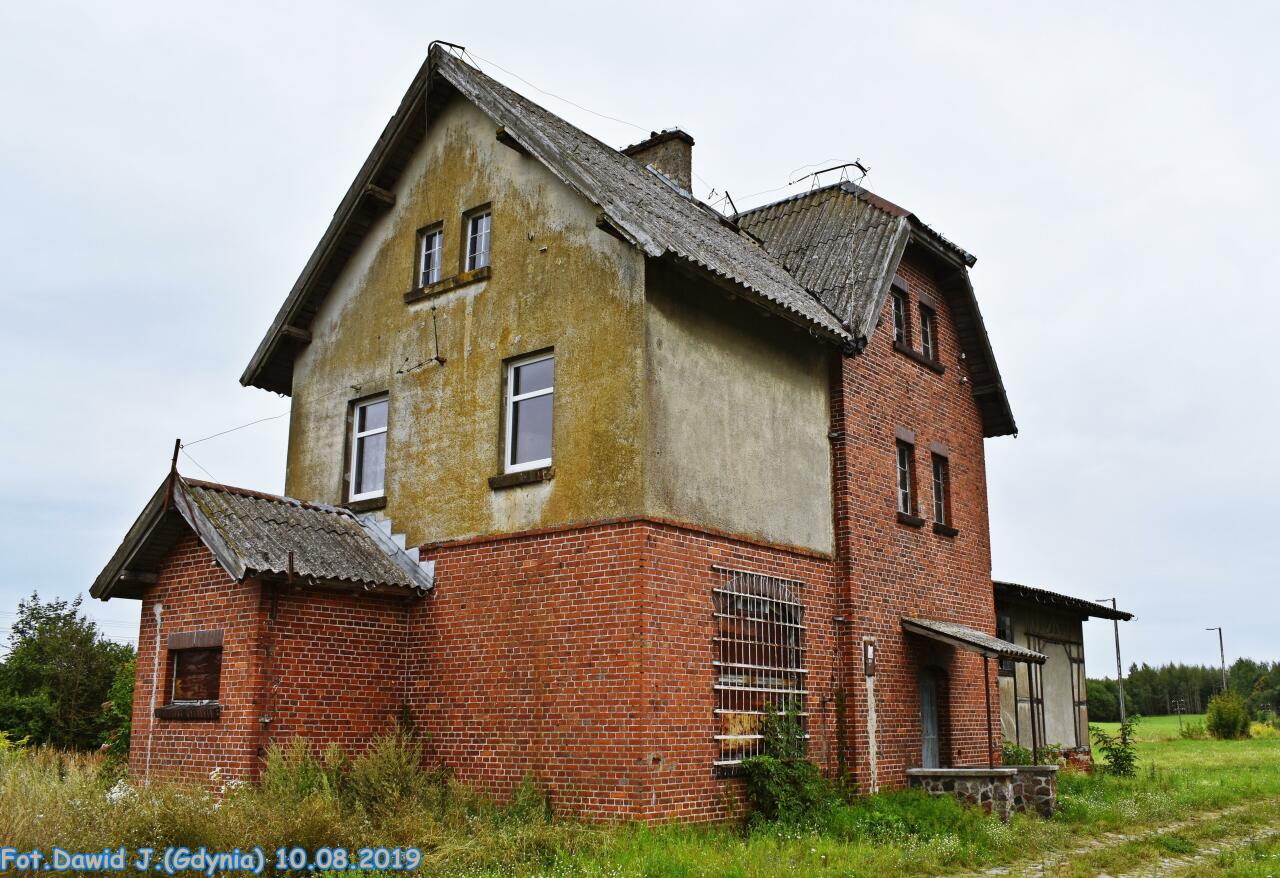 Budynek dworcowy widoczny od strony torów. W pobliżu znajduję się kolejowy budynek mieszkalny i budynek WC. Tablica z nazwą przystanku osobowego. W lewo Ełk w prawo Orzysz, Czerwonka, Olsztyn Główny.