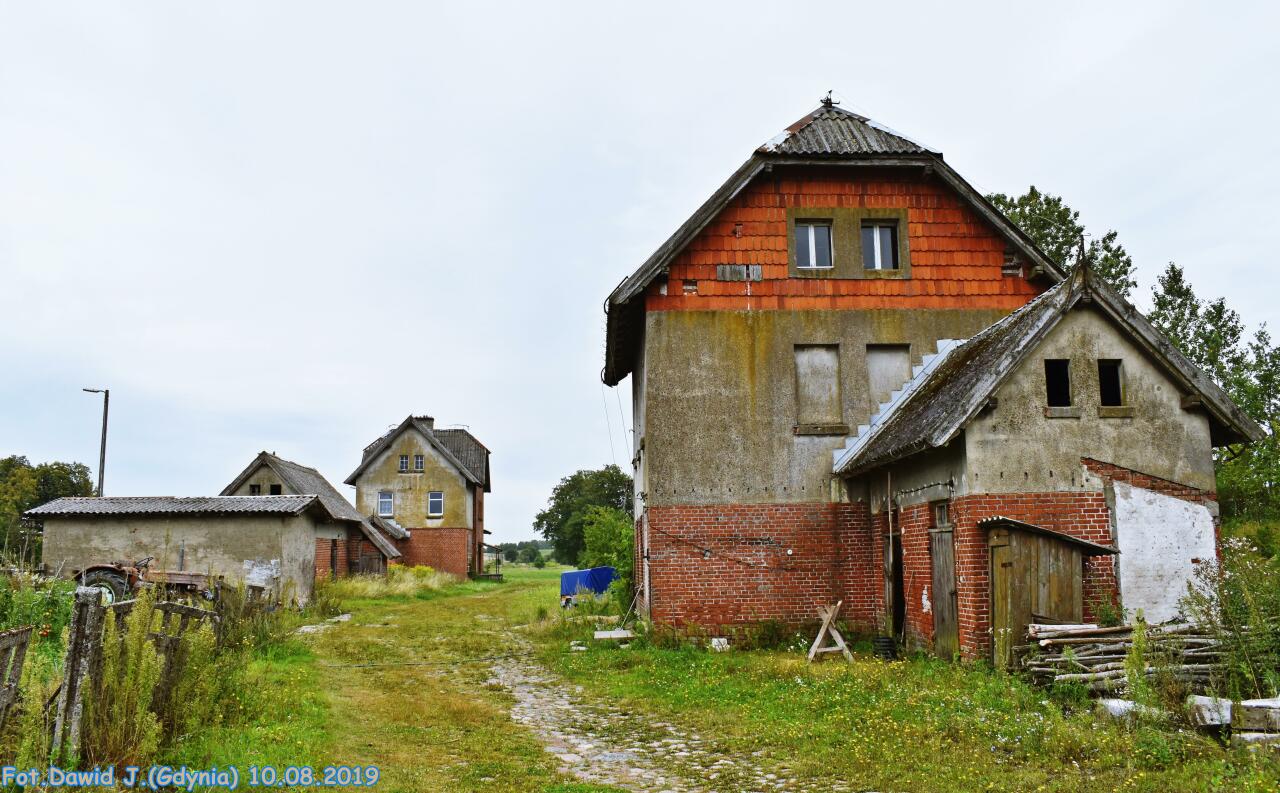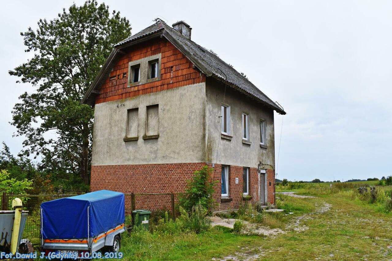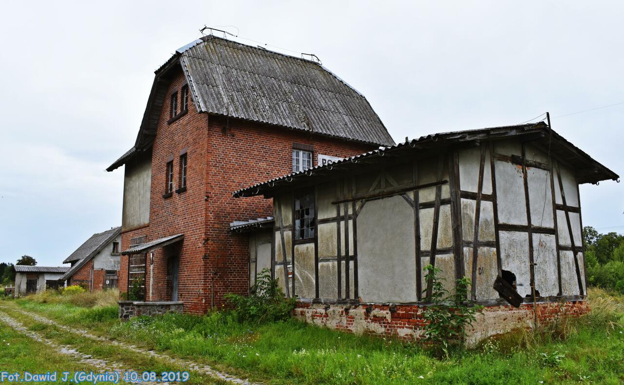 Kolejowy budynek mieszkalny z przyległą częścią z pomieszczeniami gospodarczymi, budynek małego magazynu, budynek WC budynek dworcowy. Obiekty widoczne od strony torów. Widok w kierunku Ełku.